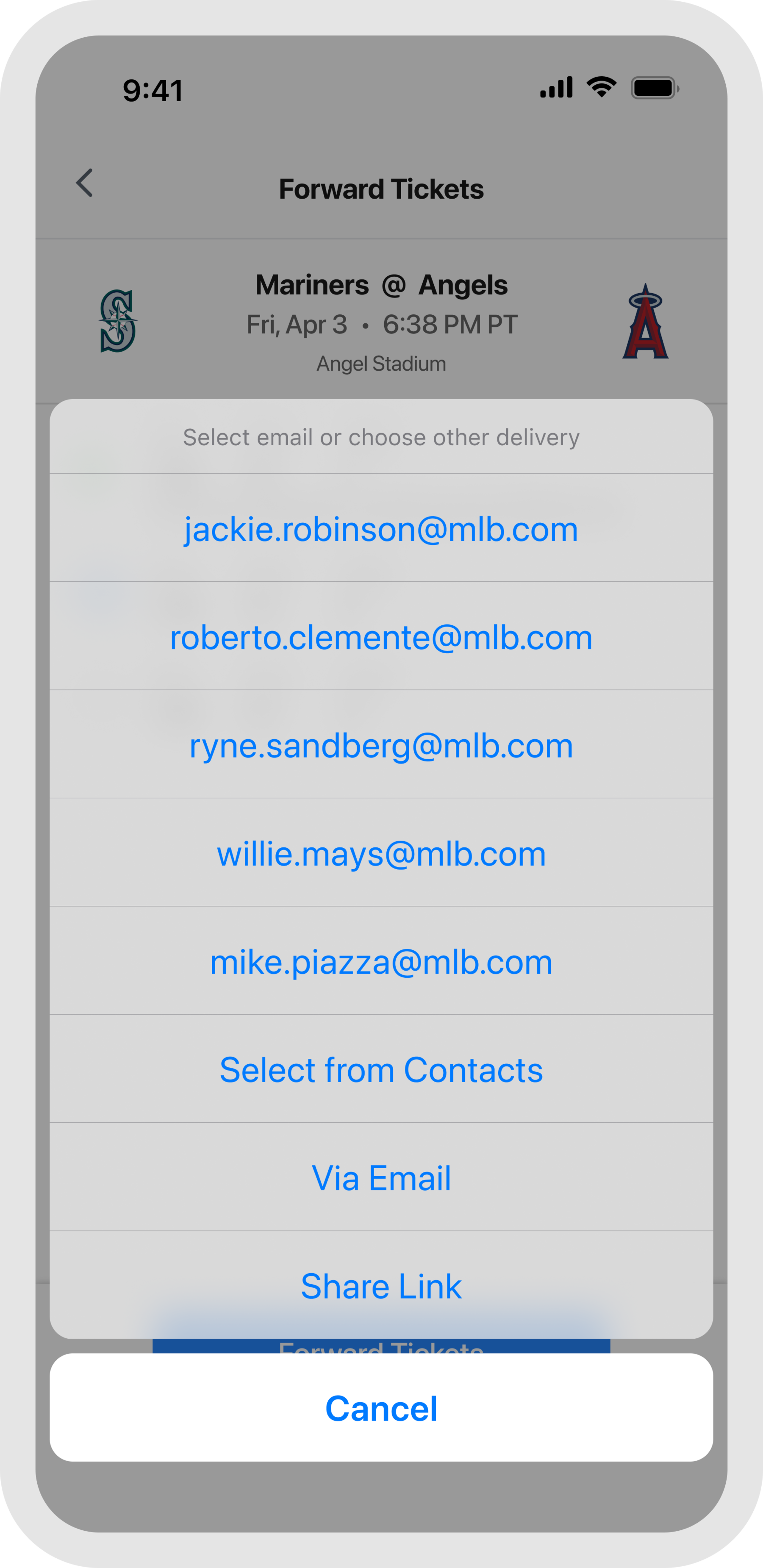No email address? Use the share link option and send tickets directly through text. Having your number saved in their contacts helps ensure the message does not get filtered as unknown. Once they tap the link, the tickets will be waiting in their MLB Ballpark app account.