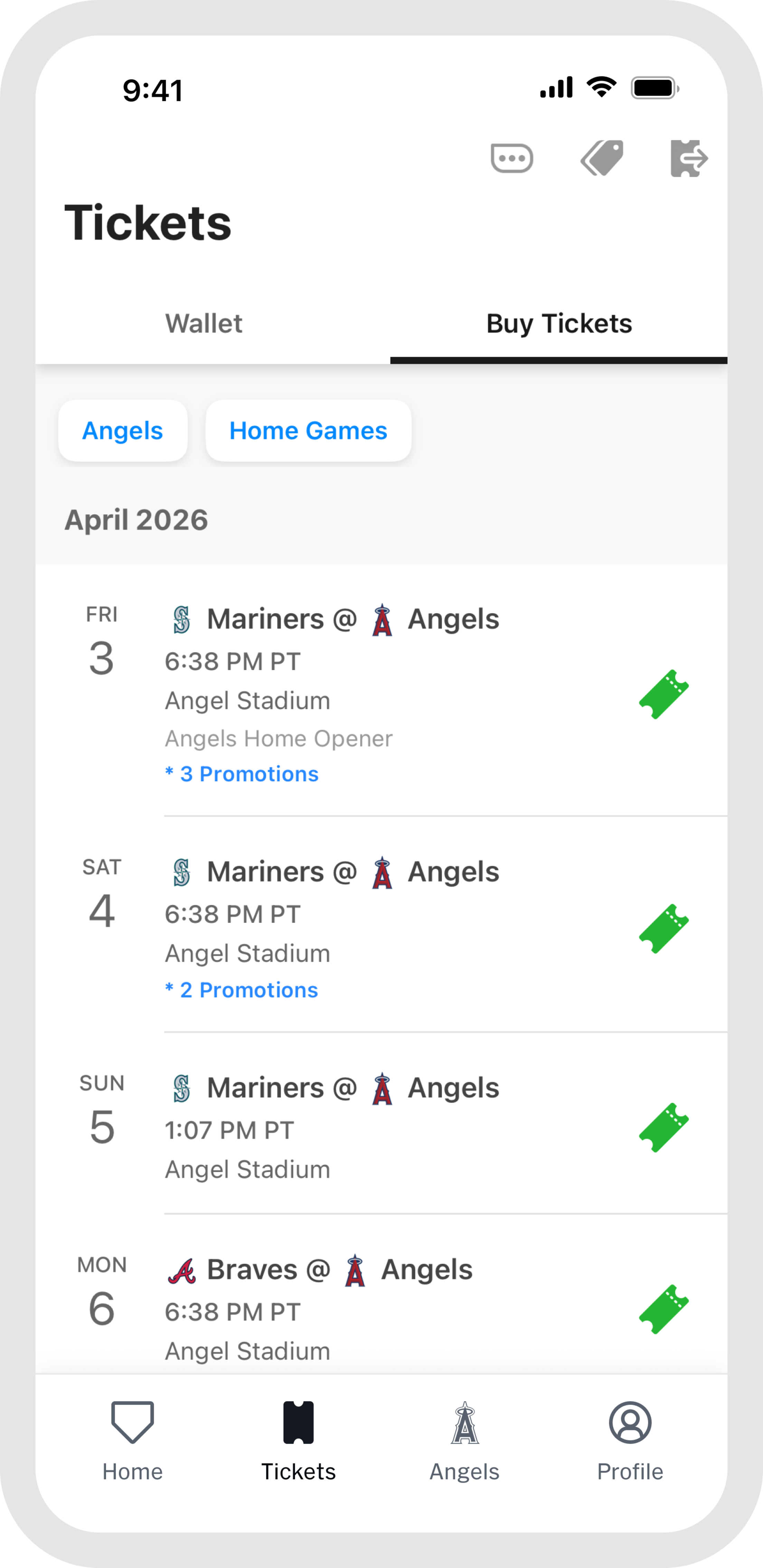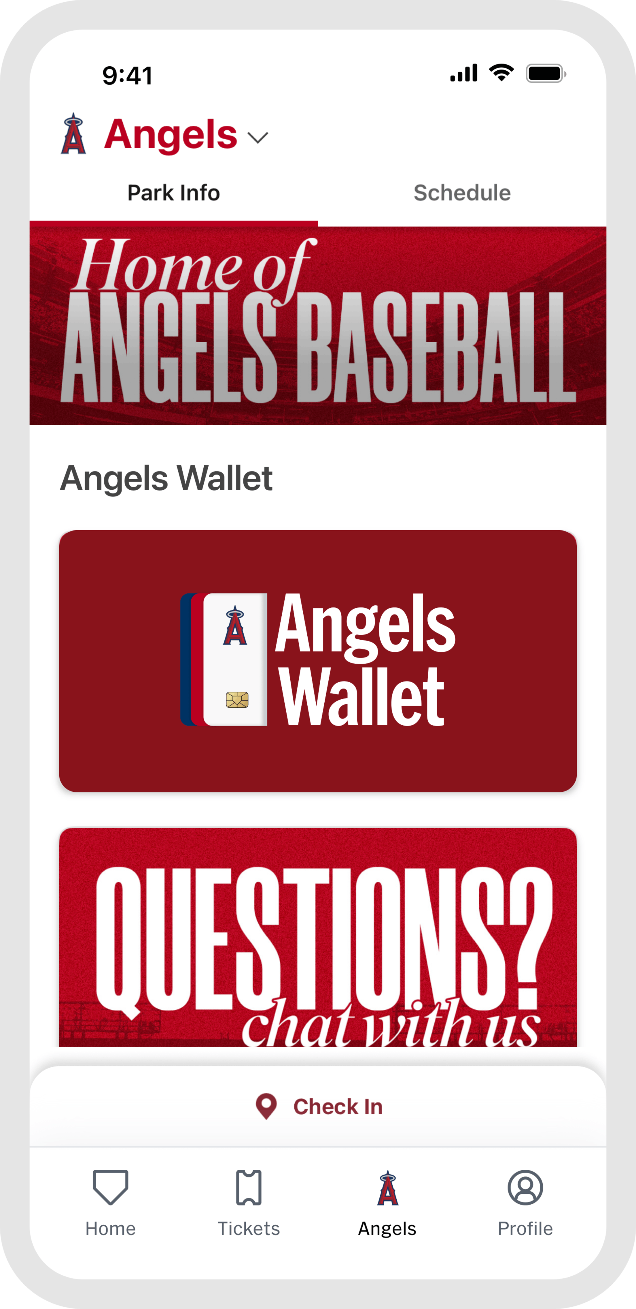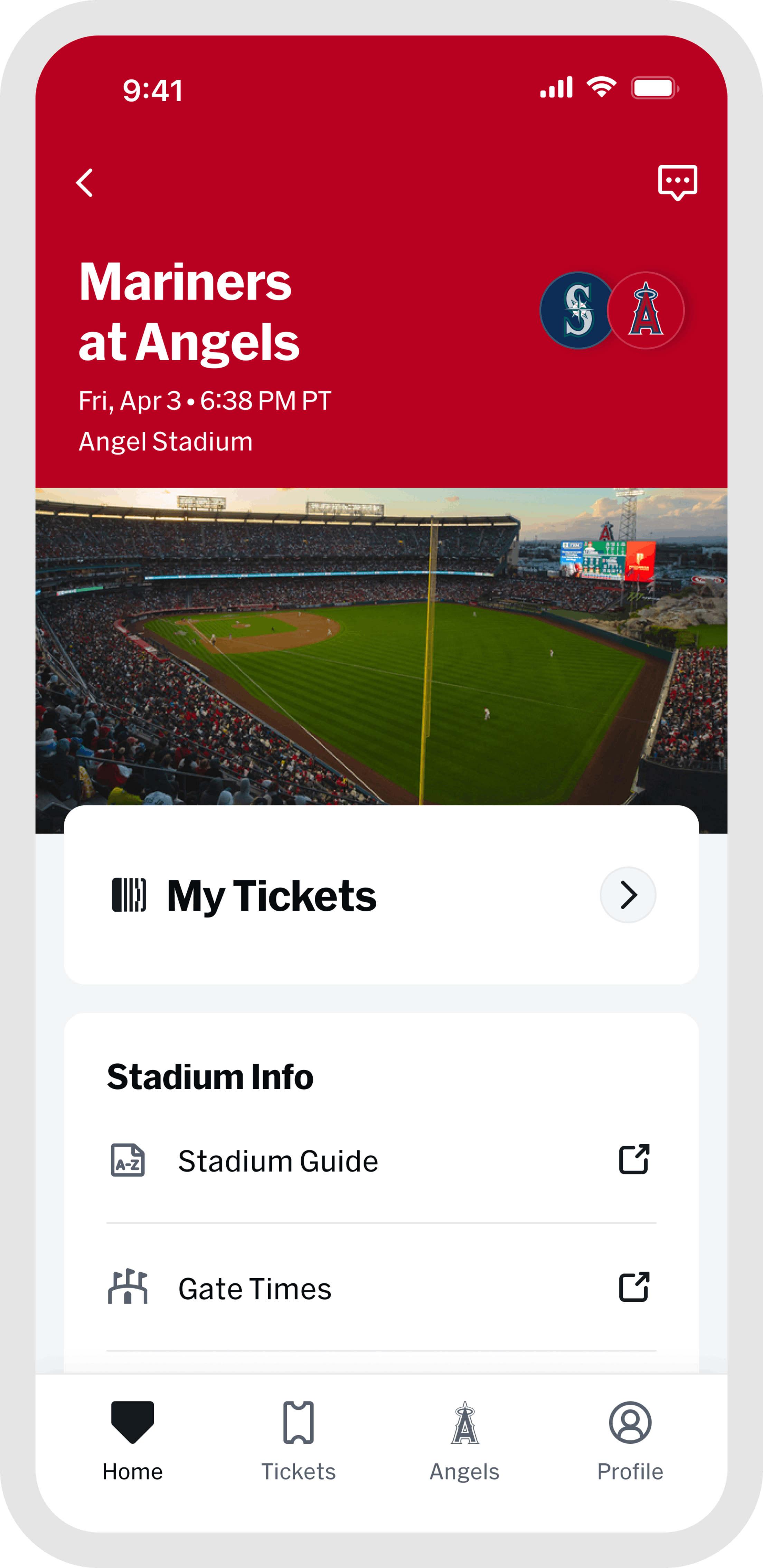 Once you are at the game, the "Home" and "Angels" tabs are your go-to for everything venue-related. Browse stadium maps, jump into interactive games, find concession info, and access in-game features all designed to make your experience better from first pitch to final out. When the game wraps up, head to "My History" in the "Profile" tab to revisit every game you have attended, all in one place.