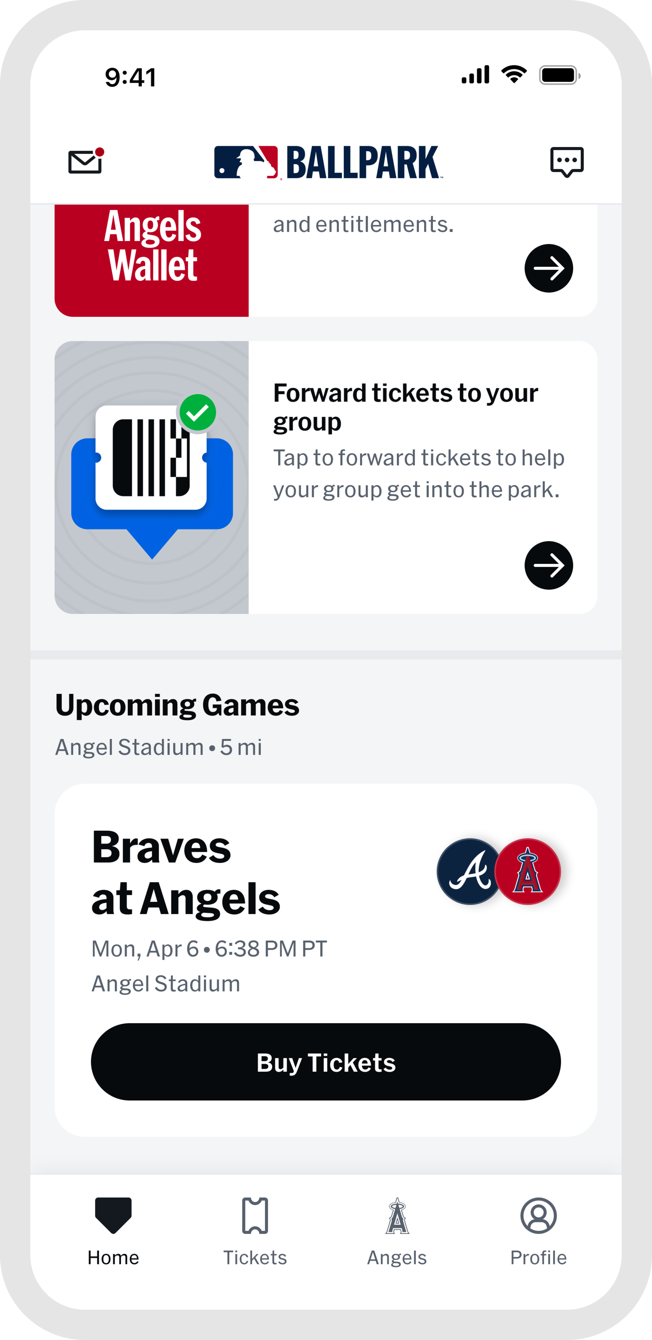 Head to the "Tickets" tab, tap "Wallet," and select the game you are attending. From your ticket list, tap the forward button and choose which tickets to send.