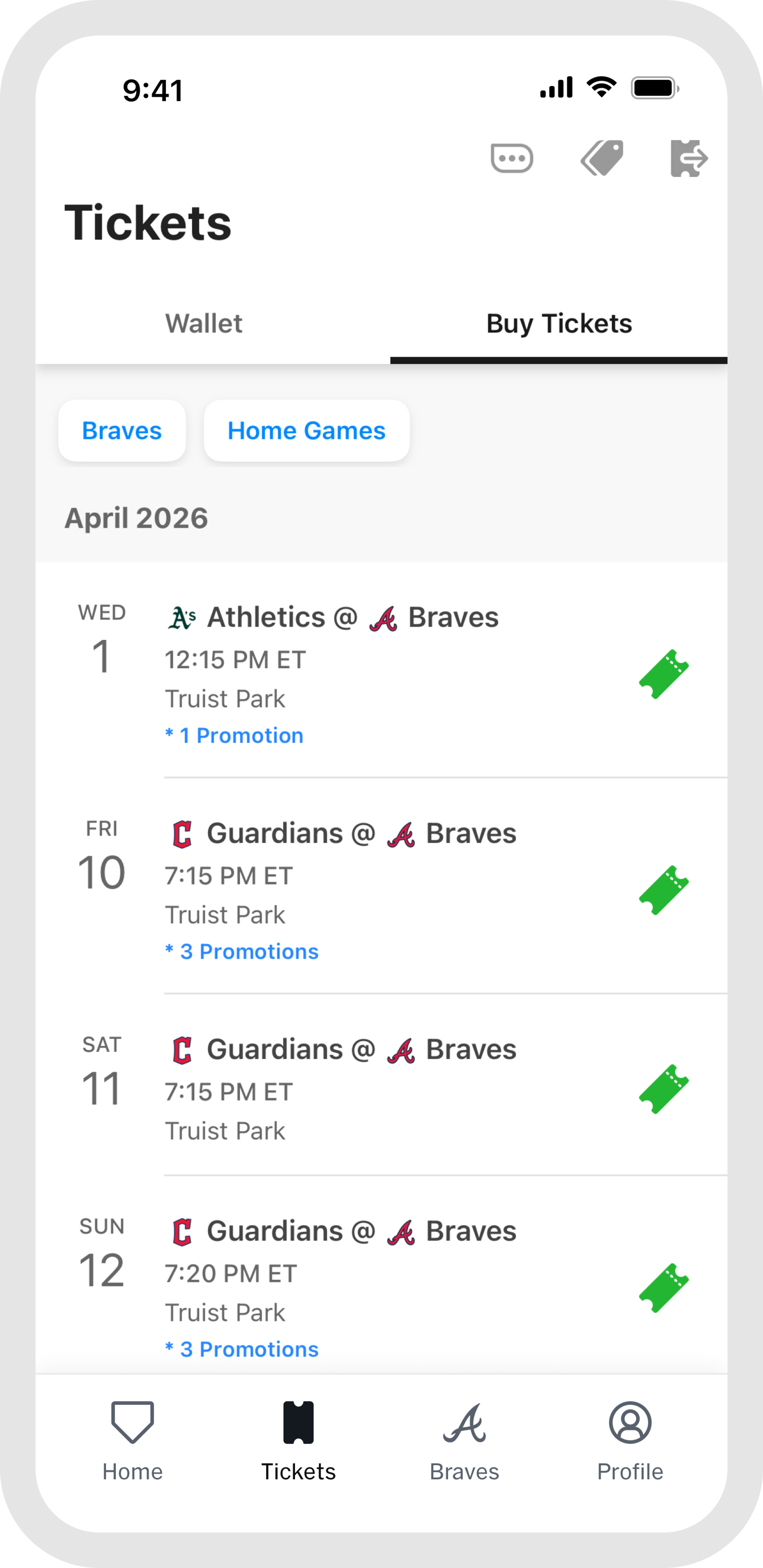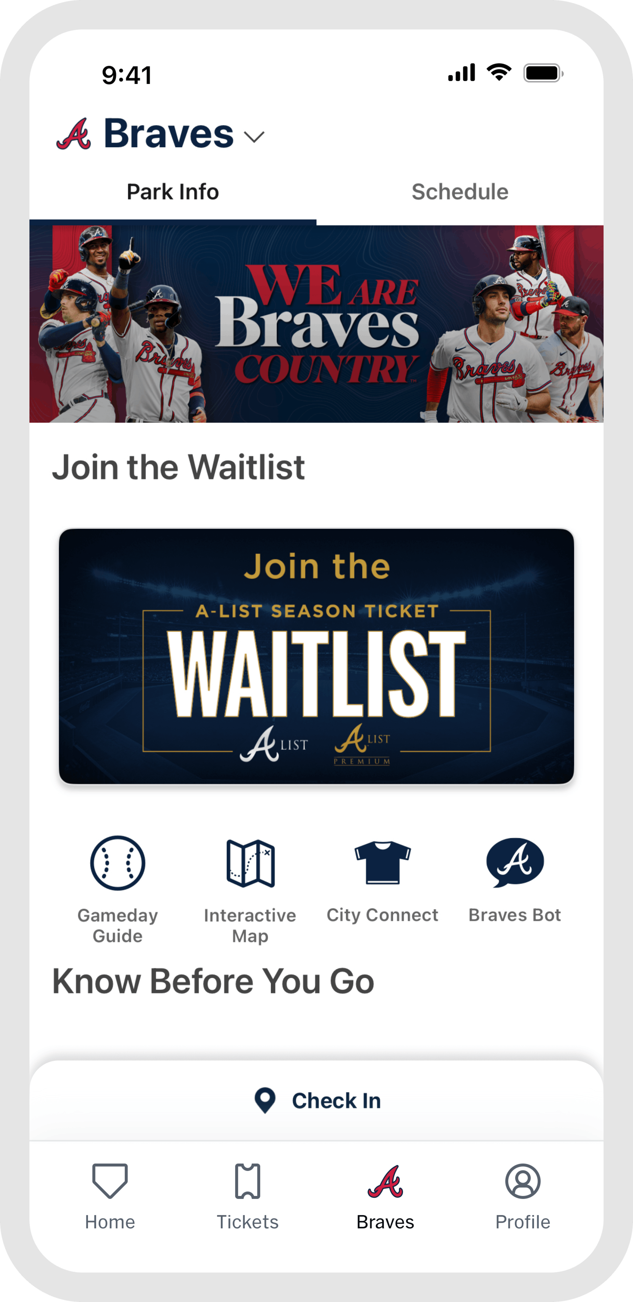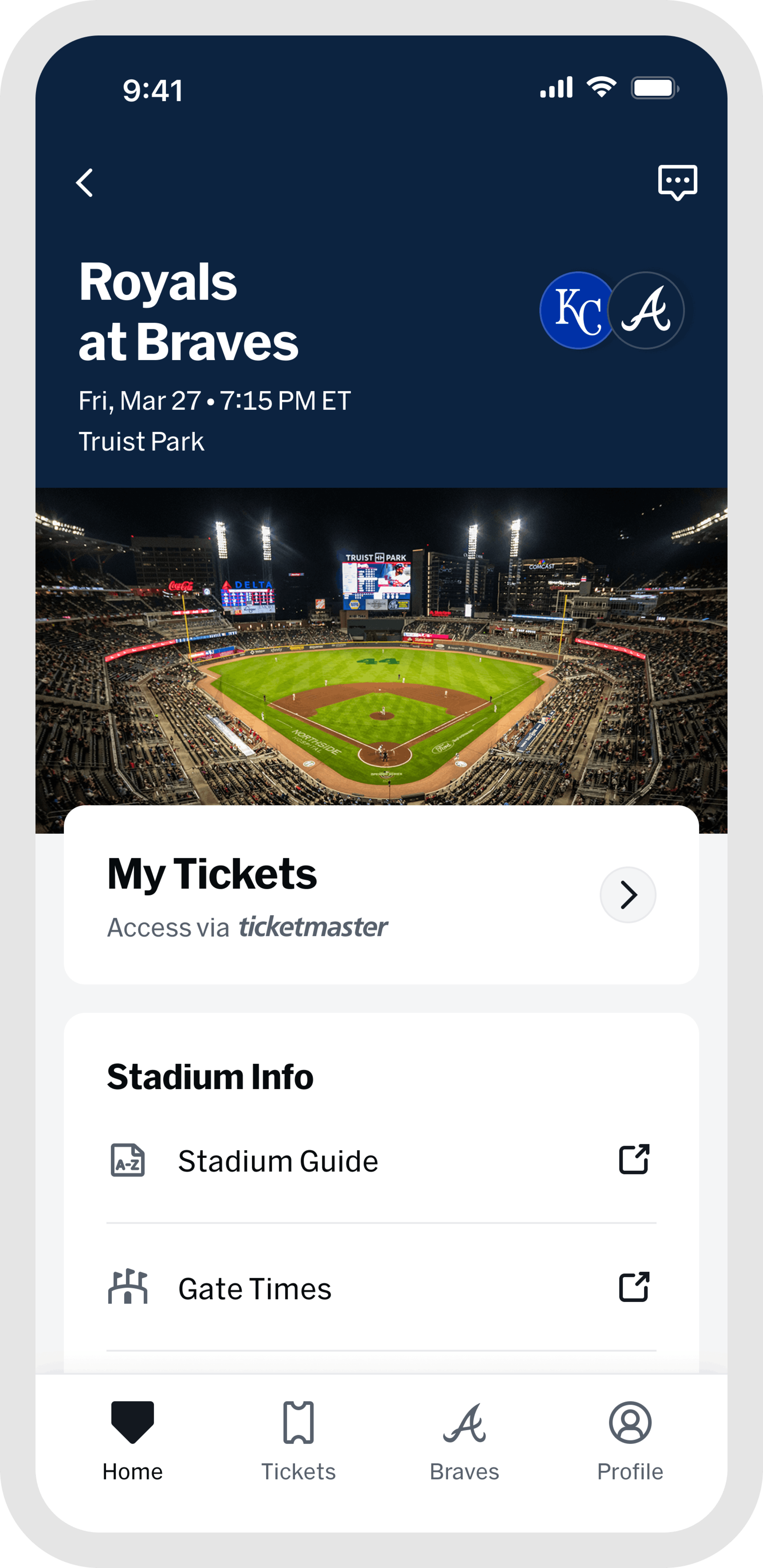 Once you are at the game, the "Home" and "Braves" tabs are your go-to for everything venue-related. Browse stadium maps, jump into interactive games, find concession info, and access in-game features all designed to make your experience better from first pitch to final out. When the game wraps up, head to "My History" in the "Profile" tab to revisit every game you have attended, all in one place.