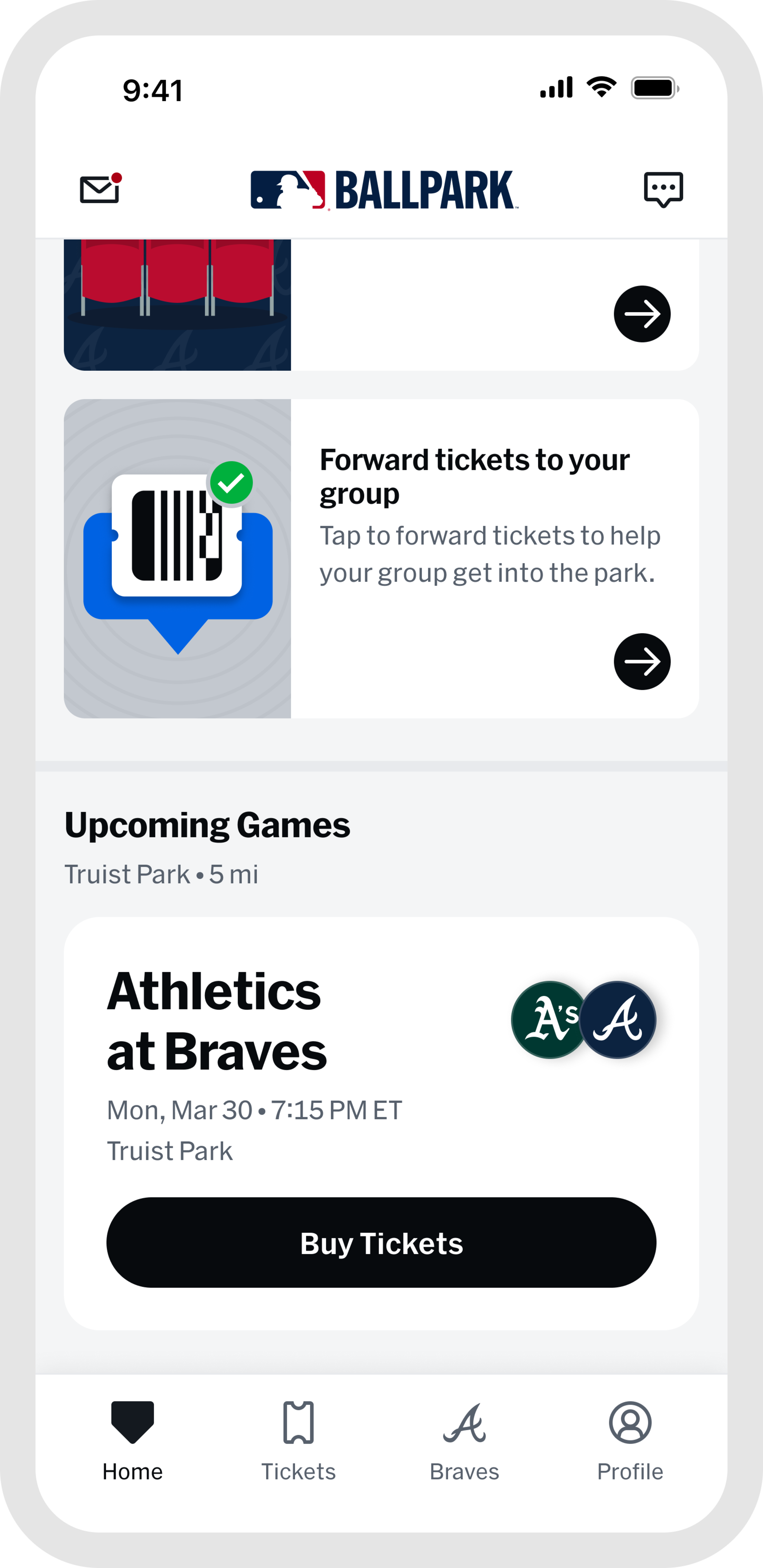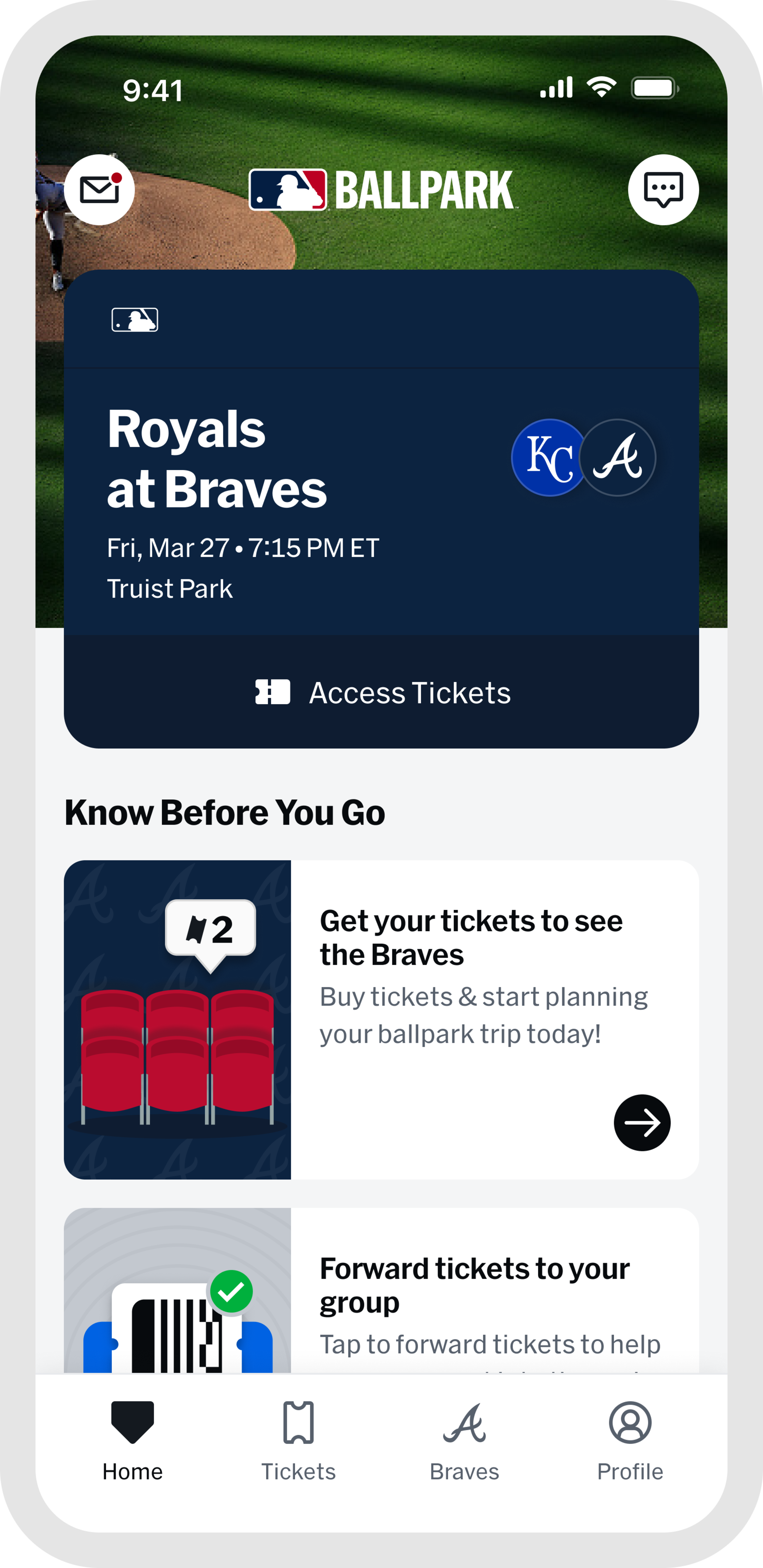 Head to the "Tickets" tab, tap "Wallet," and select the game you are attending. From your ticket list, tap the forward button and choose which tickets to send.