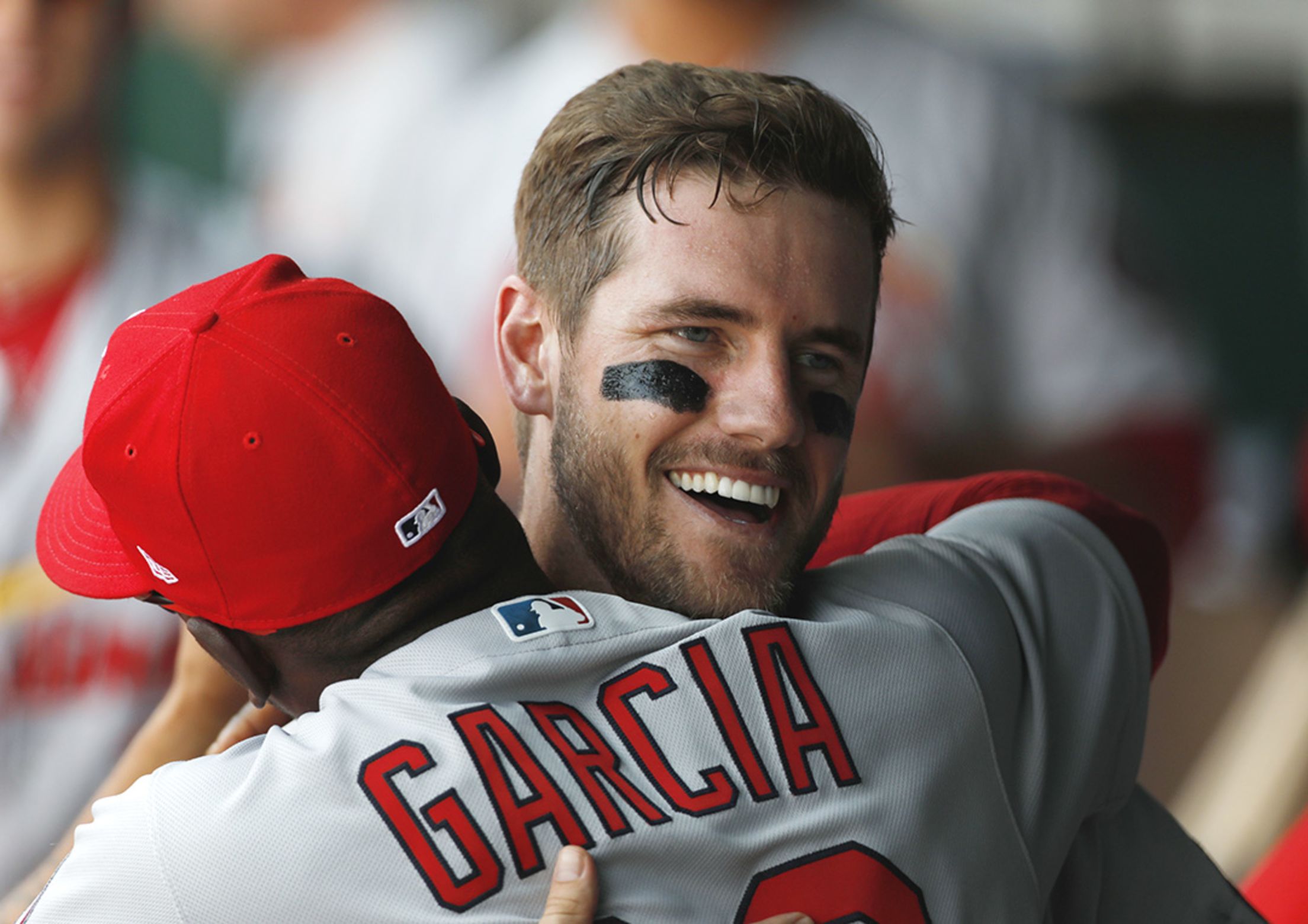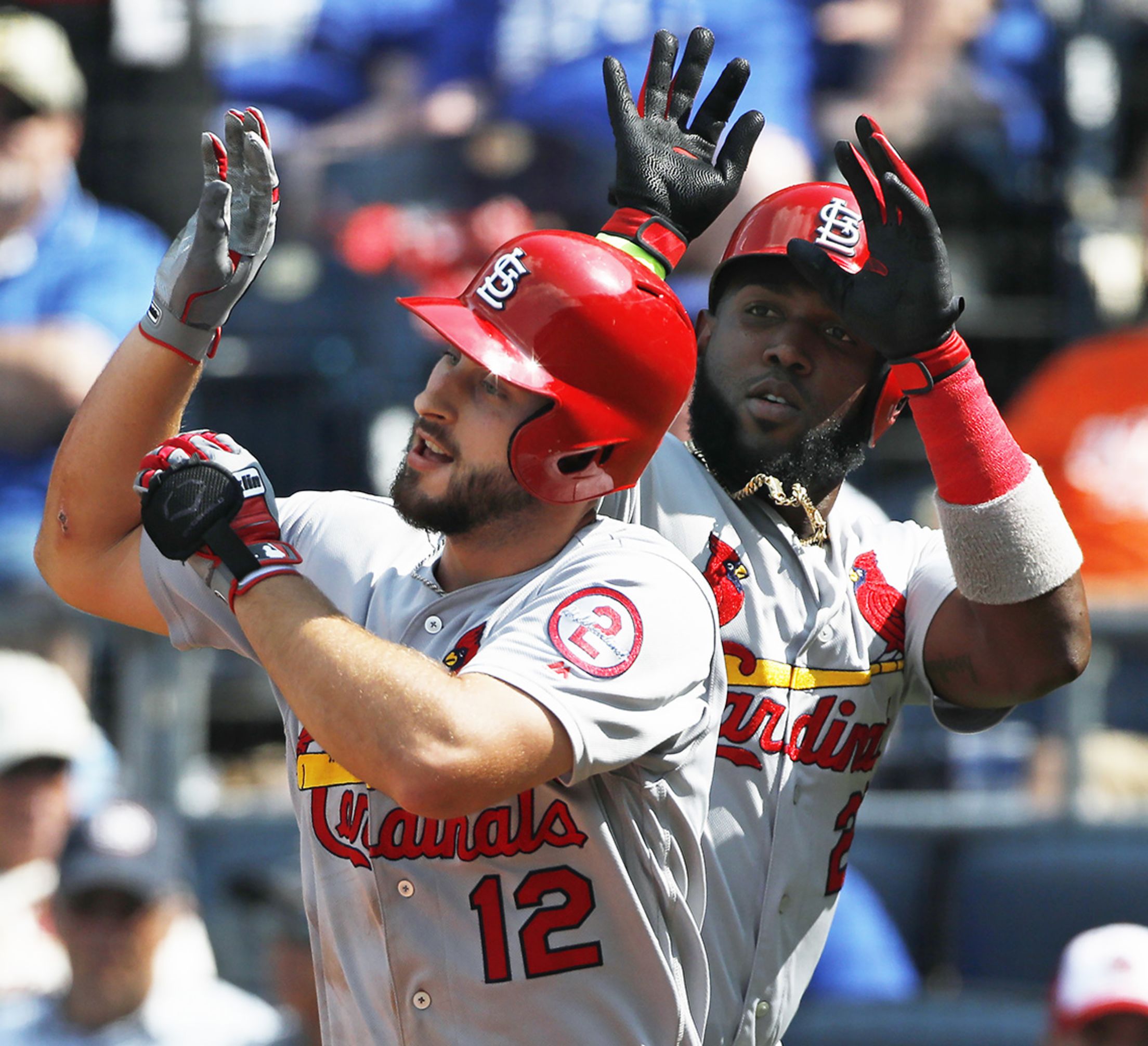 Sunday, Aug. 12, at Kansas City - Cardinals 8, Royals 2: Promoted to the majors just days apart after spending the start of 2018 at Memphis, outfielder Adolis Garcia embraced Patrick Wisdom after the first baseman notched a couple of big-league firsts (hit and run scored) in the third inning of his debut. Garcia had collected his first hit in Friday night's win over the Royals. (Associated Press)