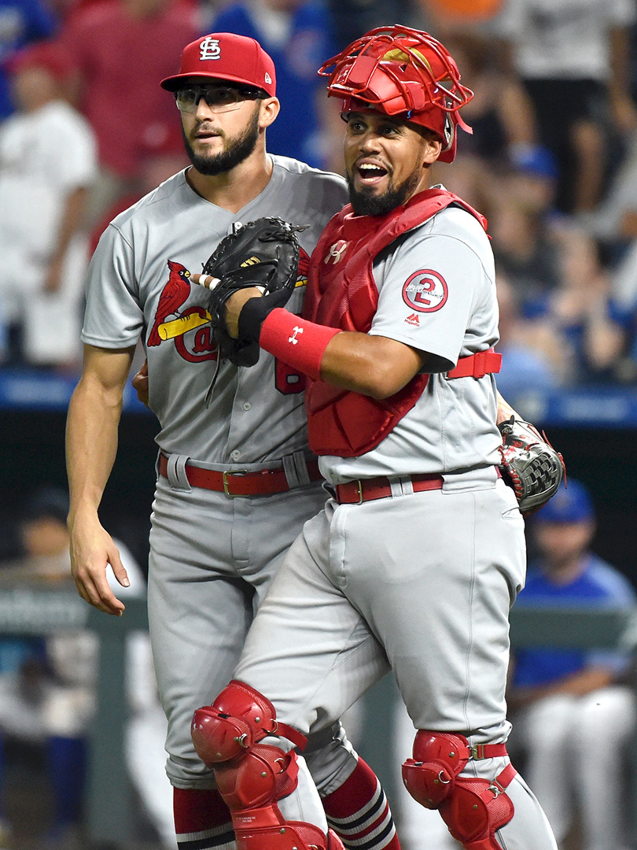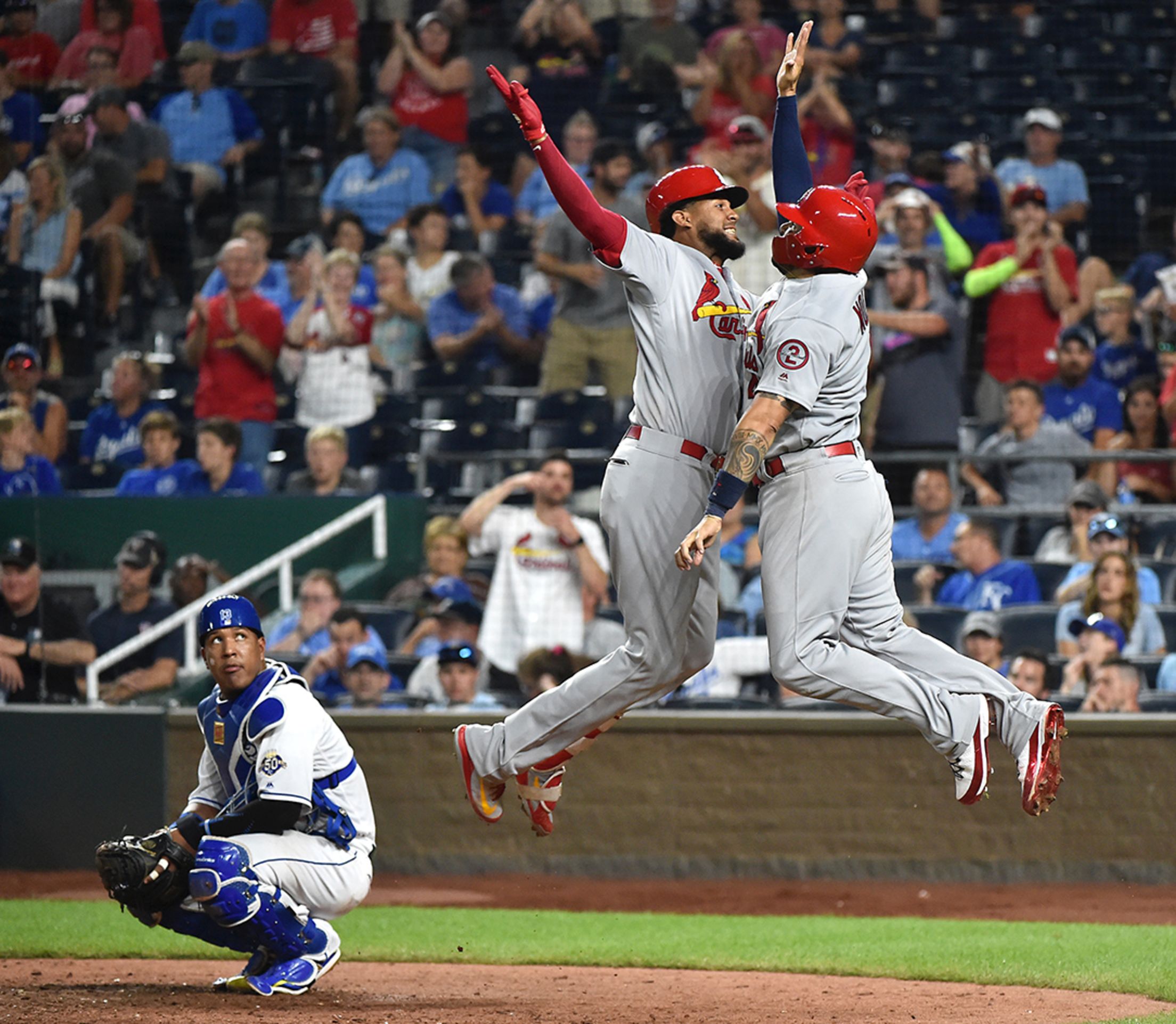 Saturday, Aug. 11, at Kansas City - Cardinals 8, Royals 3: Royals catcher Salvador Perez never saw Jose Martinez make it to Kansas City when J-Mart won the PCL batting title as a Royals farmhand in 2015. But he got a front-row seat for Martinez's three-RBI night, capped by a two-run homer that scored Yadier Molina (right) in the ninth. (Getty Images)