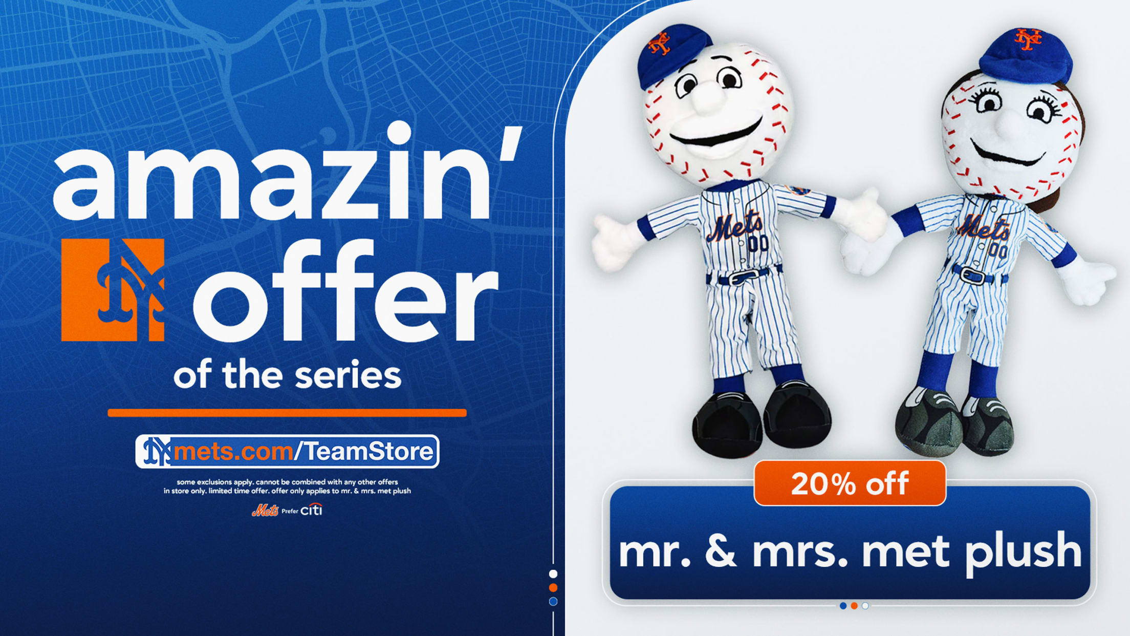 Mr. & Mrs. Met Plush Toys are 20% off during the April 7-9 games against the Diamondbacks.
