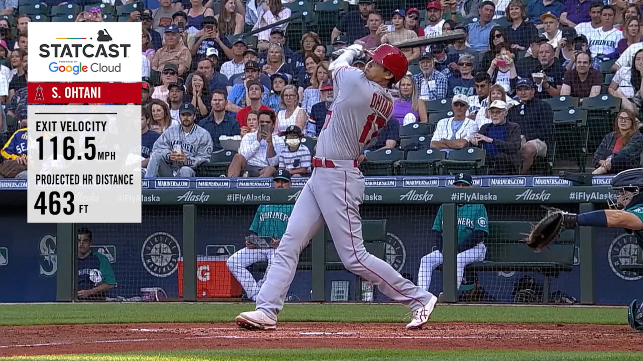 Statcast measures the exit velocity and projected distance of Shohei Ohtani's 116.5 mph, 463-foot moonshot, his 33rd dinger of the season