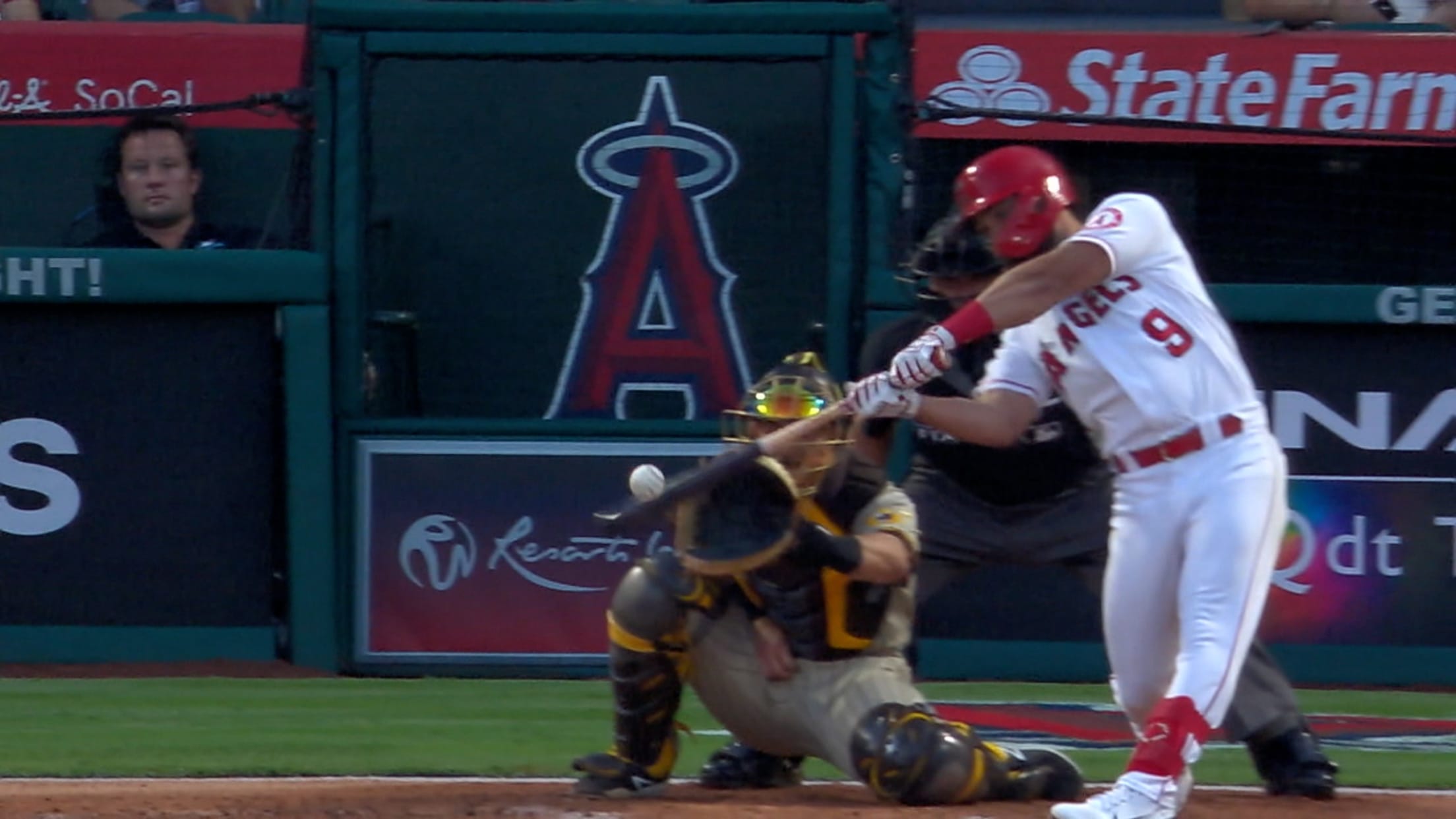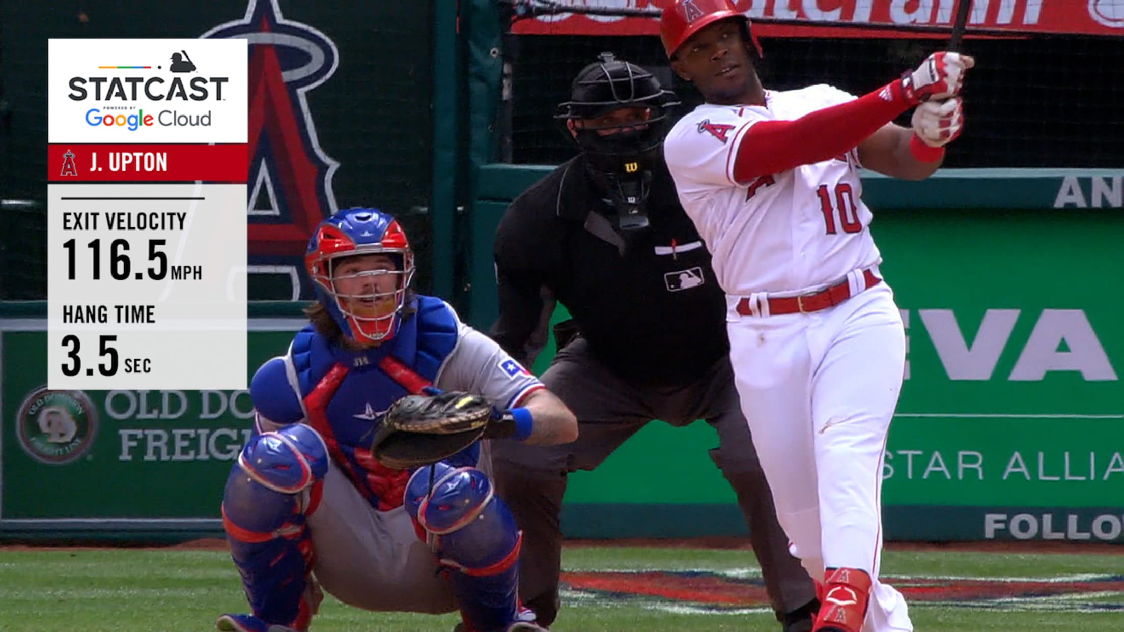 Statcast measures the exit velocity and hang time of Justin Upton's solo home run against the Rangers