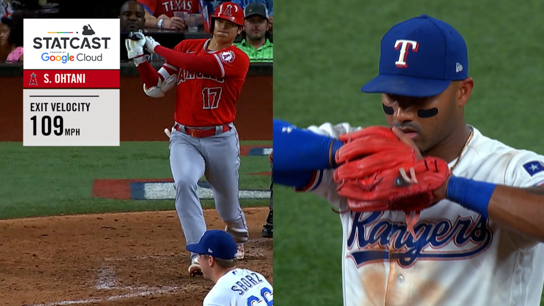 Statcast measures the exit velocity off of Shohei Ohtani's 109 mph hit that broke the glove of Andy Ibáñez on its way into right field