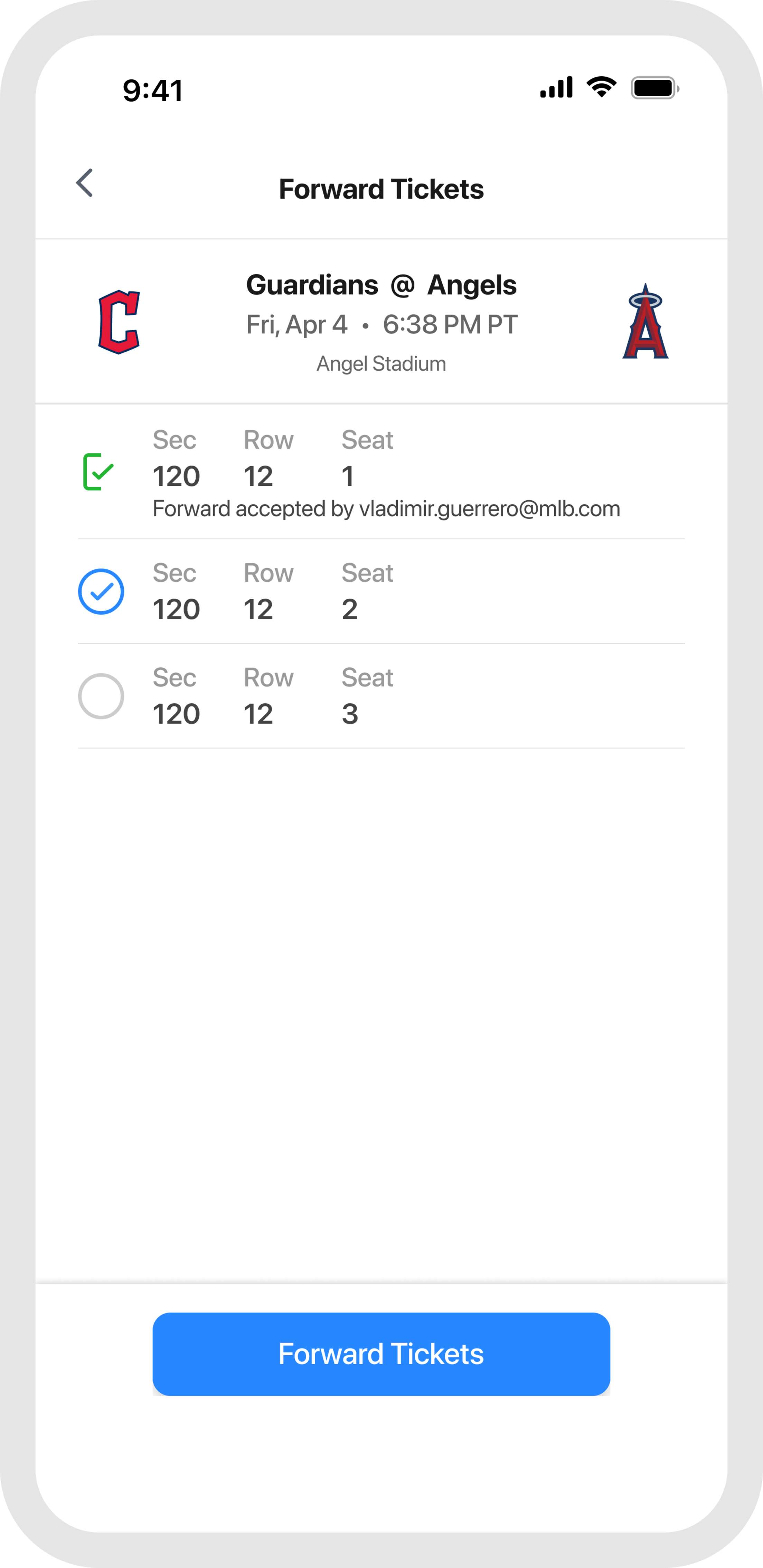 Forward a ticket by navigating to "Wallet" within the "Tickets" tab and selecting the game you're attending. From the list of tickets for that game, tap the forward button and choose which tickets you'd like to send.