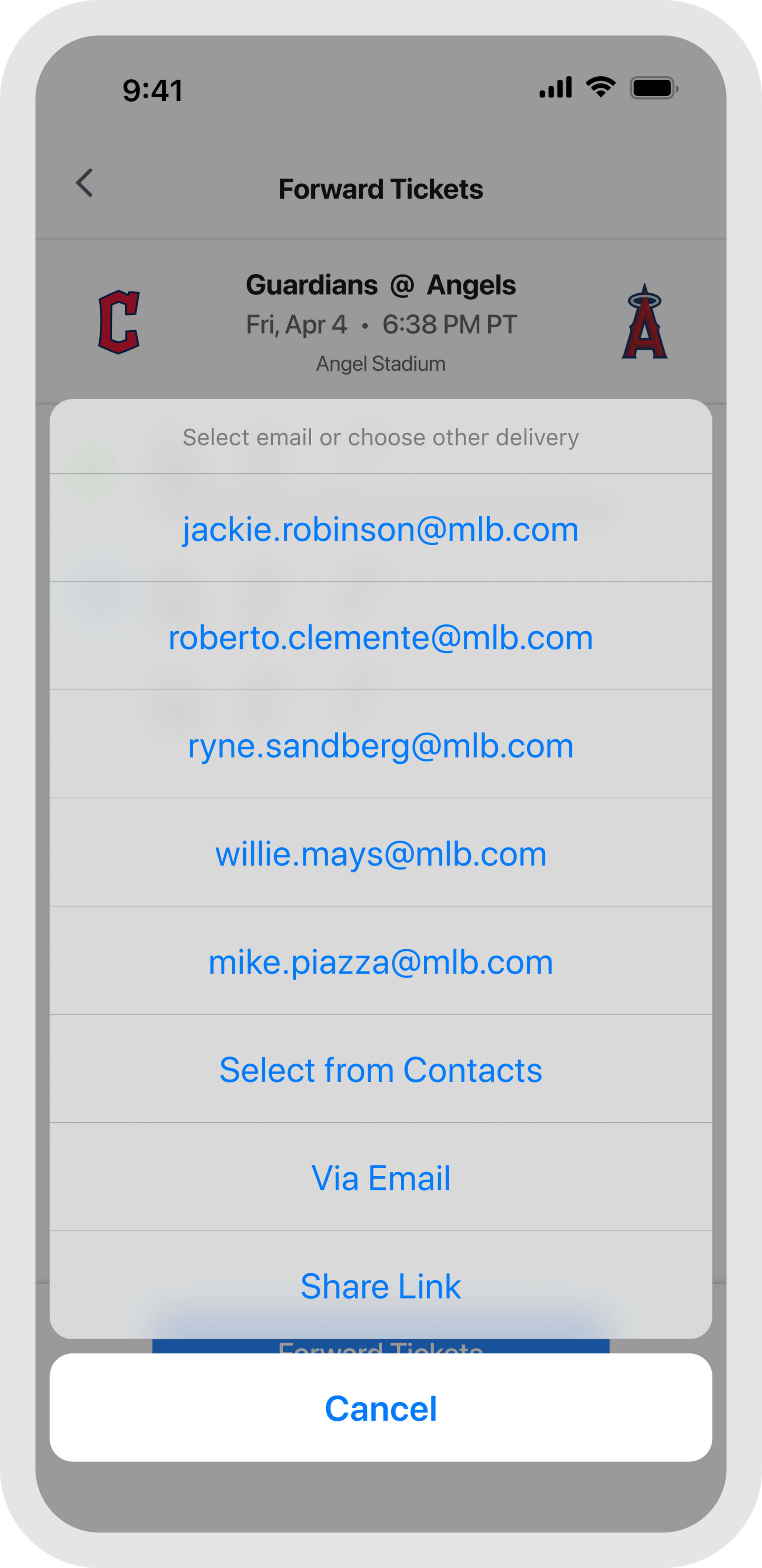 If you choose to forward via email, you can enter an email address manually, select a contact from your device's address book, or quickly send tickets to friends you've recently forwarded to by tapping on their email. Your friend will receive a notification letting them know you've sent them mobile tickets.