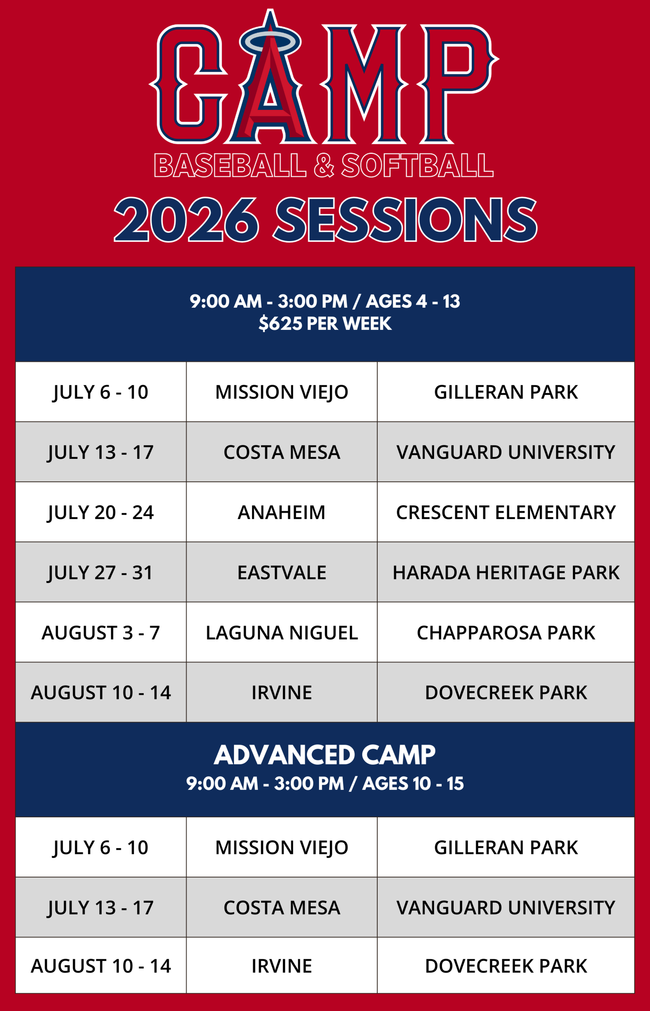 A: Angels Baseball and Softball Camps are offered for boys and girls ages 4-13