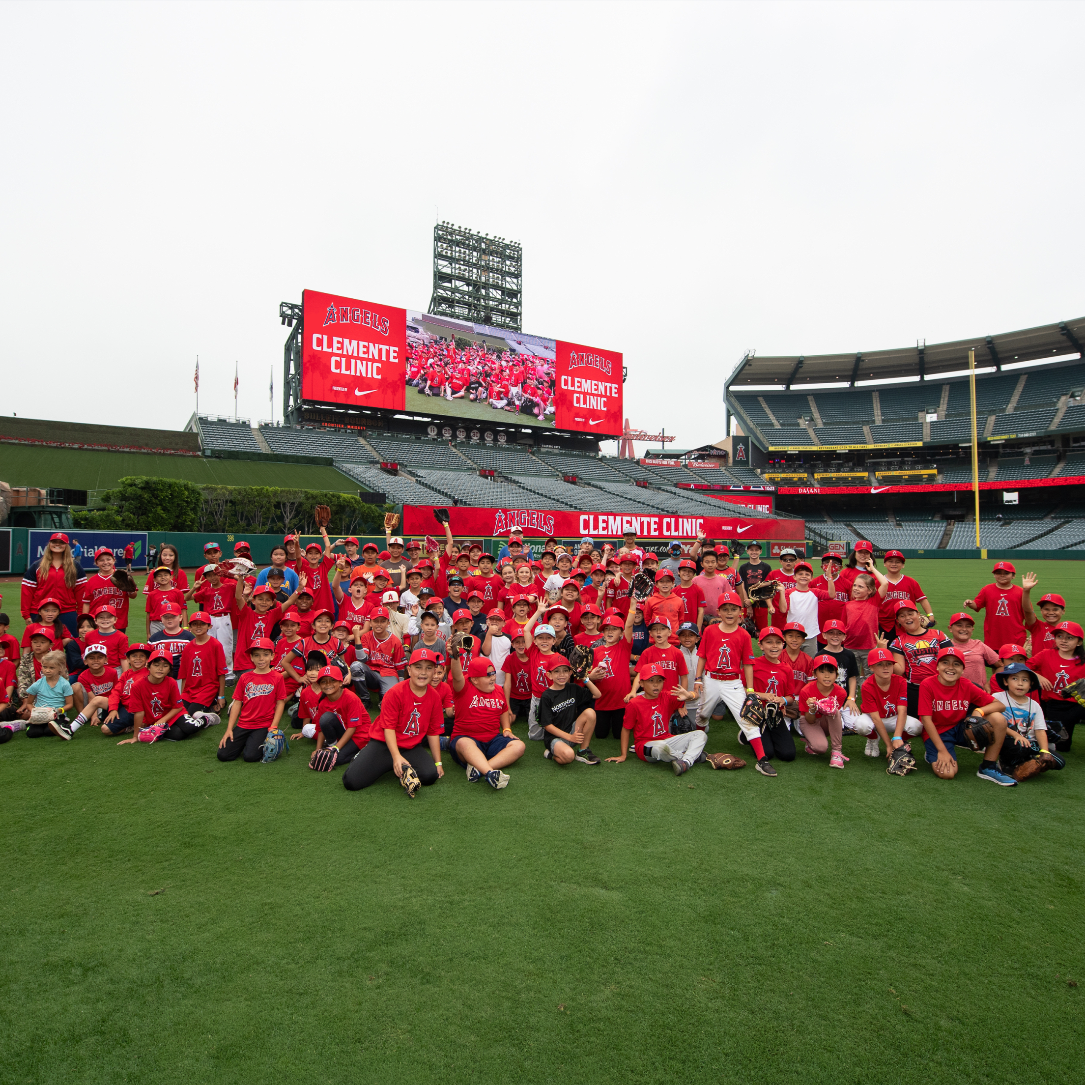 Local kids, ages 6-12, are able to take the field at Angel Stadium during our Clemente Clinic, presented by Nike. Participants spend the day learning about the game of baseball in the outfield, bullpen, and even the Angels dugout! Additionally, all attendees learn more about the clinic's namesake, Roberto Clemente, and the philanthropic spirit that he shared within his community. After the event, each child receives a plastic bat and ball set to take home and continue practicing!