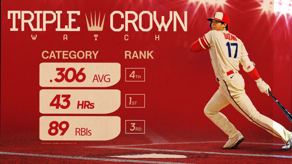 Daily updates on this story were paused on Aug. 20 with Ohtani's .306 batting average trailing a few elite American League hitters. (Ohtani led the AL at that time with 43 homers and was three RBIs off the pace with 89.) Updates will resume if Ohtani mounts a strong Triple Crown threat down the stretch.
