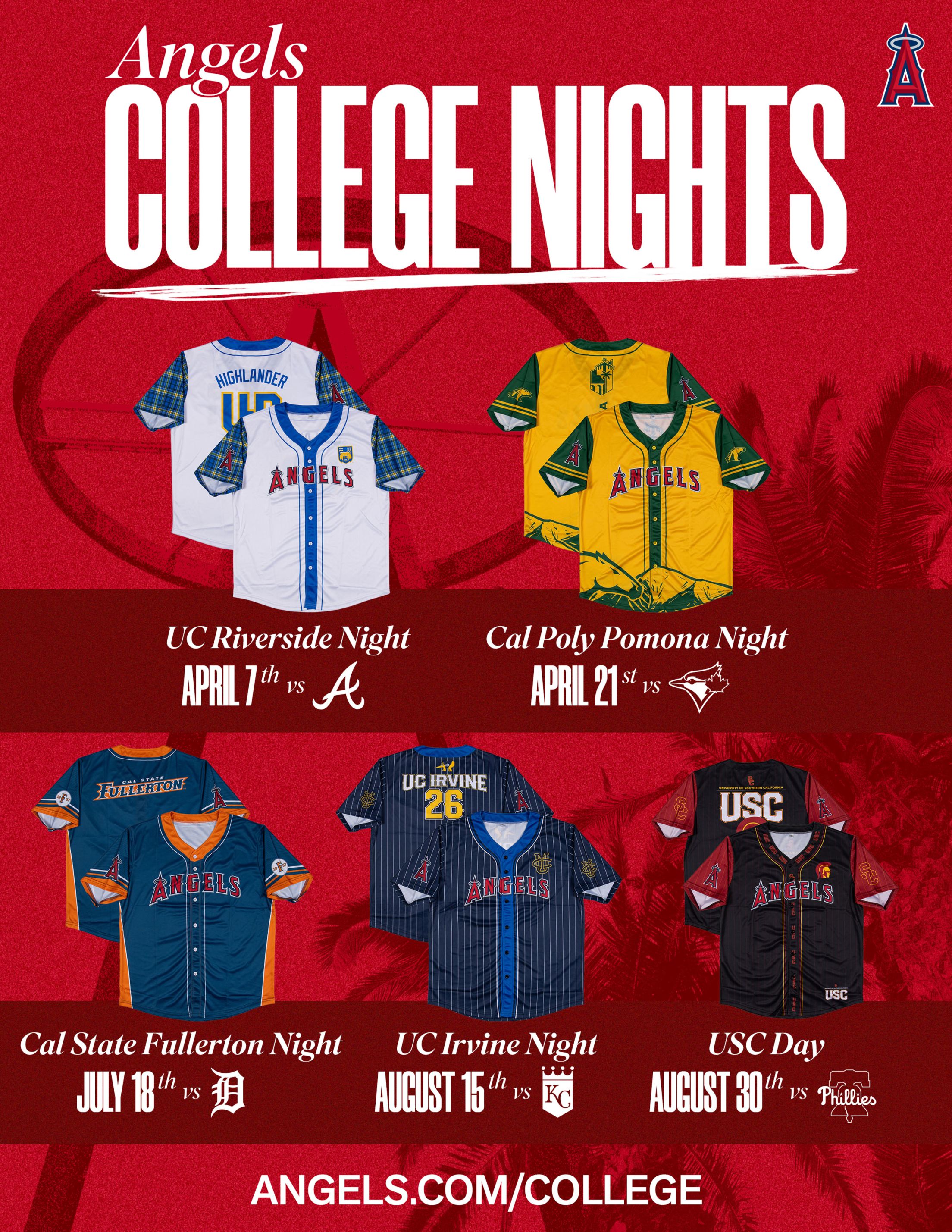College Nights are back for the 2026 season featuring all new customized jerseys for each school! We will be celebrating 5 Southern California schools here at Angel Stadium starting as early as April! Bring your group, family, friends, and fellow students to enjoy these special events while taking home your unique custom Angels college jersey!