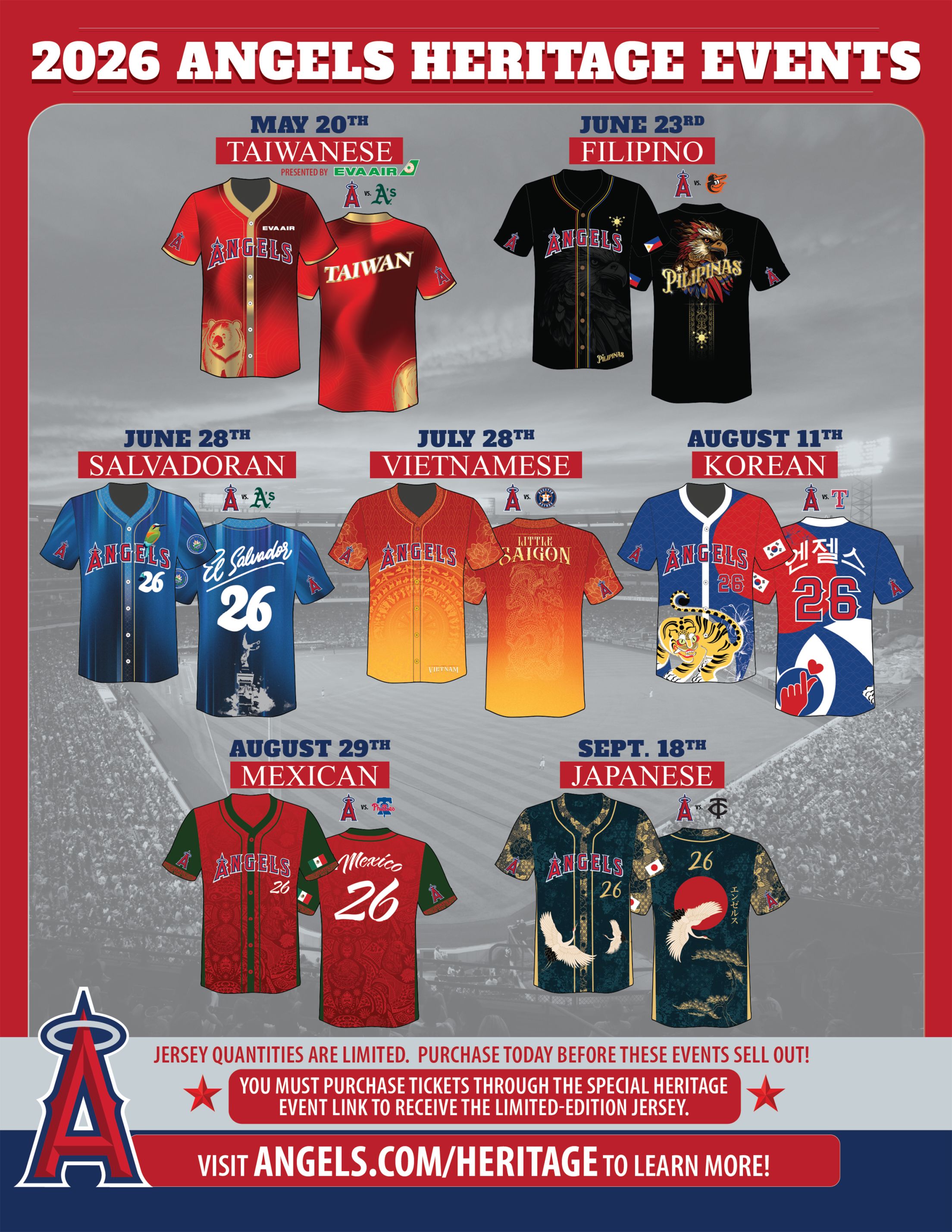 Heritage Events are back for the 2026 season at Angel Stadium! Celebrate 7 Heritage Events that highlight the unique cultural of each community. Bring your group, family, and friends to enjoy the energy of these special events while taking home a unique custom heritage Angeles jersey!