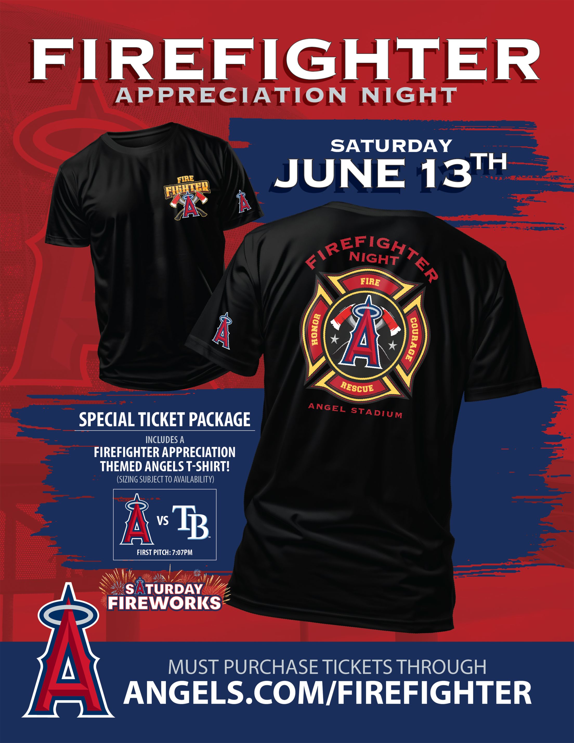 Purchase through Angels.com/firefighter to receive a Firefighter Appreciation T-shirt! T-shirt sizing subject to availability. Stick around after the game to enjoy a postgame fireworks show!