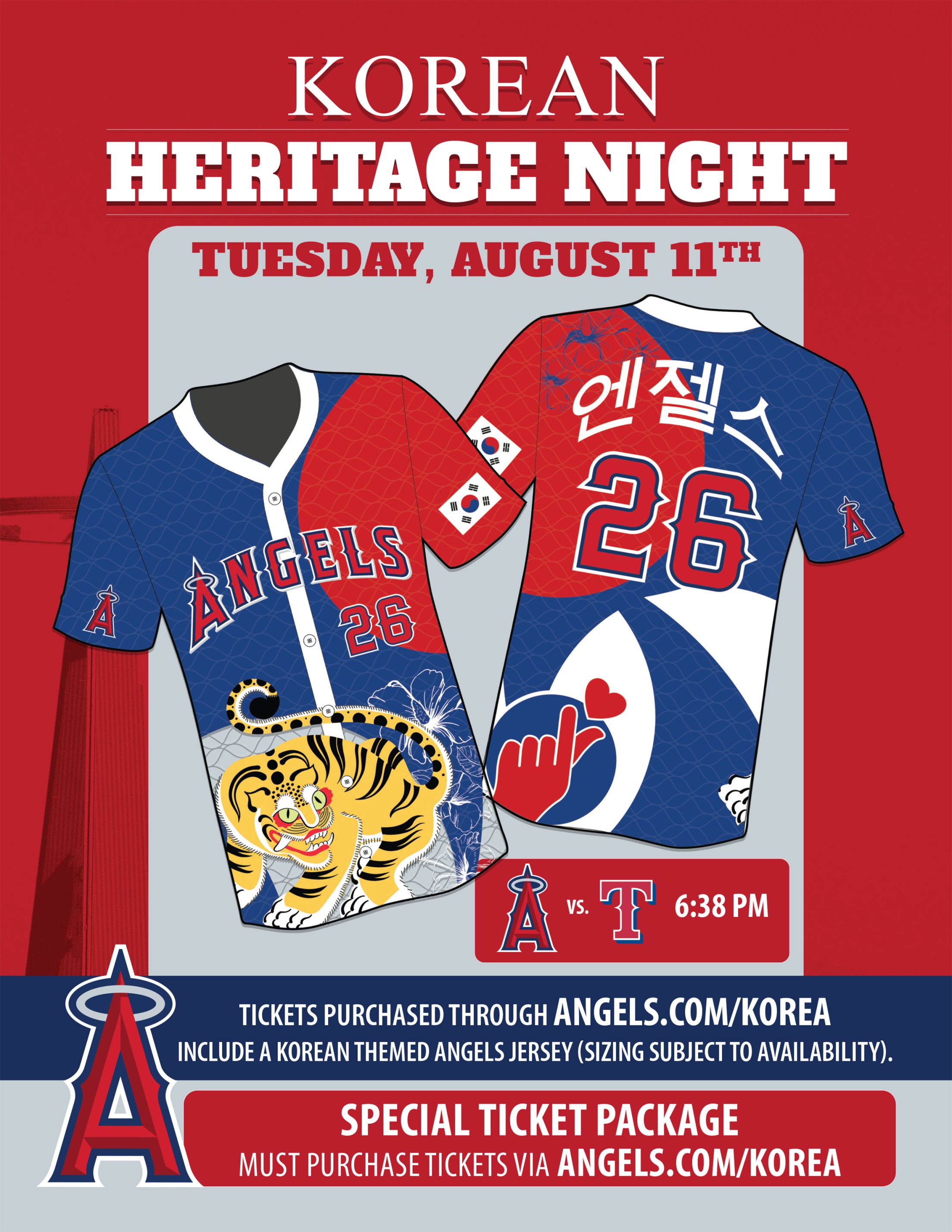 The ONLY way to receive a heritage jersey is to purchase directly through Angels.com/Korea. Korean Heritage Night sold out last season, so don’t wait! Jersey sizing subject to availability.