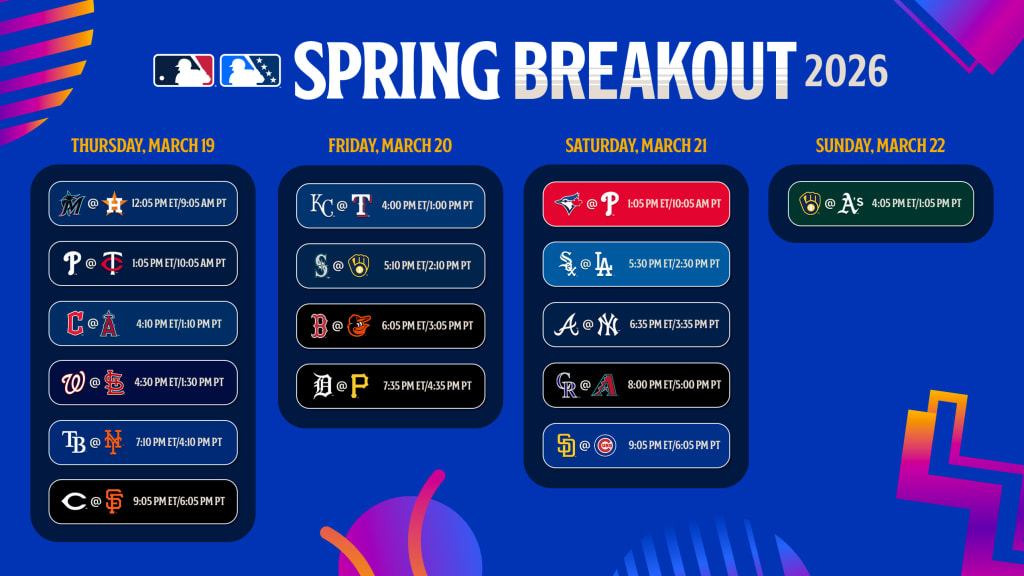 Here's the complete Spring Breakout schedule for 2026, with MLB Pipeline's preseason farm system rankings from early March in parentheses: