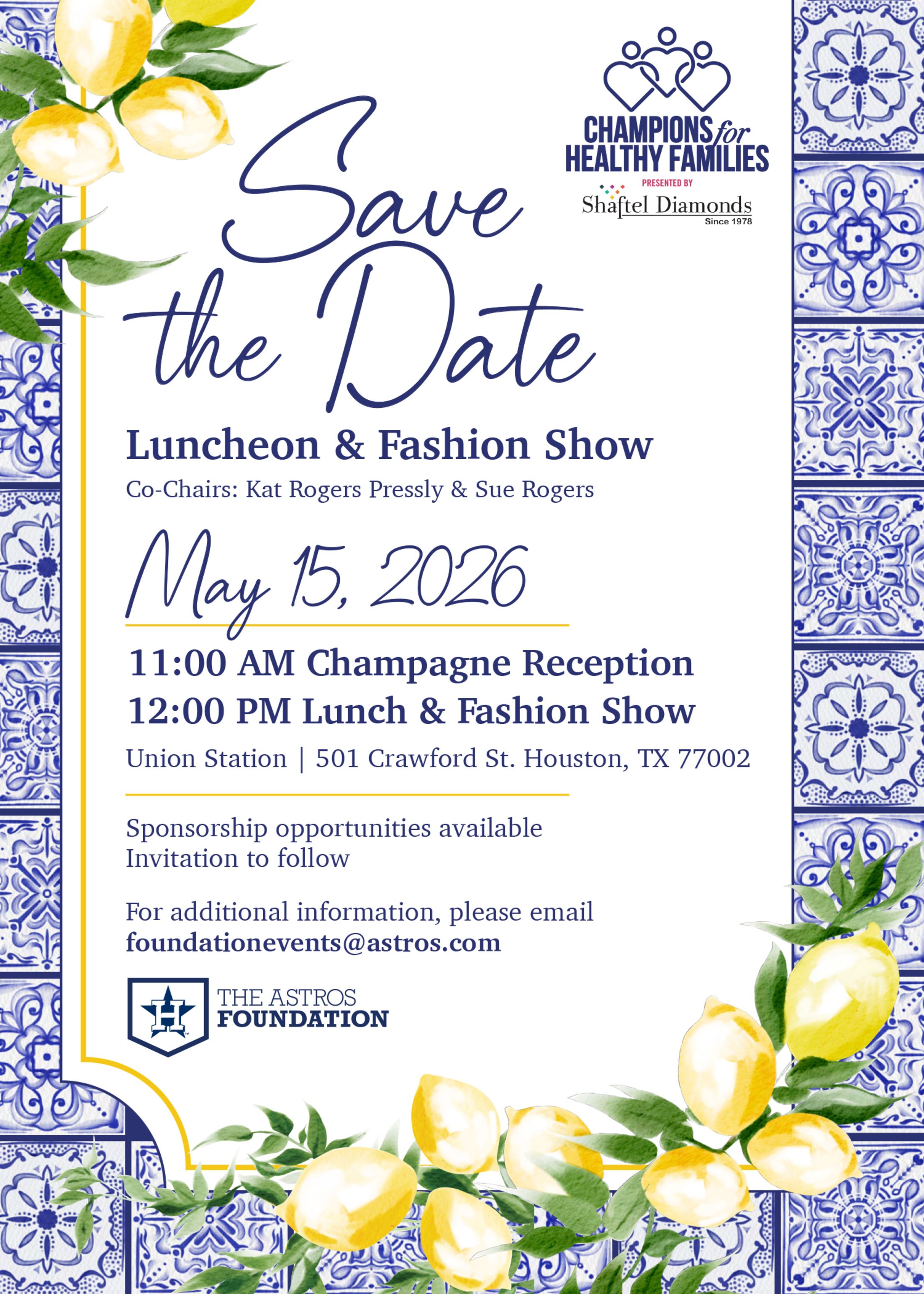The Astros Foundation is hosting the Champions for Healthy Families Lunch and Fashion Show presented by Shaftel Diamonds on Friday, May 15, 2026 at 11:00 AM. The event is Co-Chaired by Kat Rogers Pressly and Sue Rogers, and will include lunch inside historic Union Station and a stunning fashion show with Astros players' wives walking the runway, styled by Tootsies.
