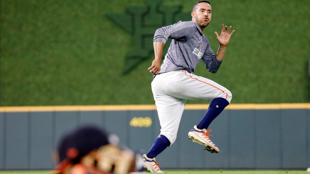 Astros shortstop Carlos Correa took batting practice on the field Sunday for the first time since suffering lower-back soreness in a game Aug. 19. Correa also took grounders from Hinch at shortstop and did some agility drills in the outfield, all without any pain.