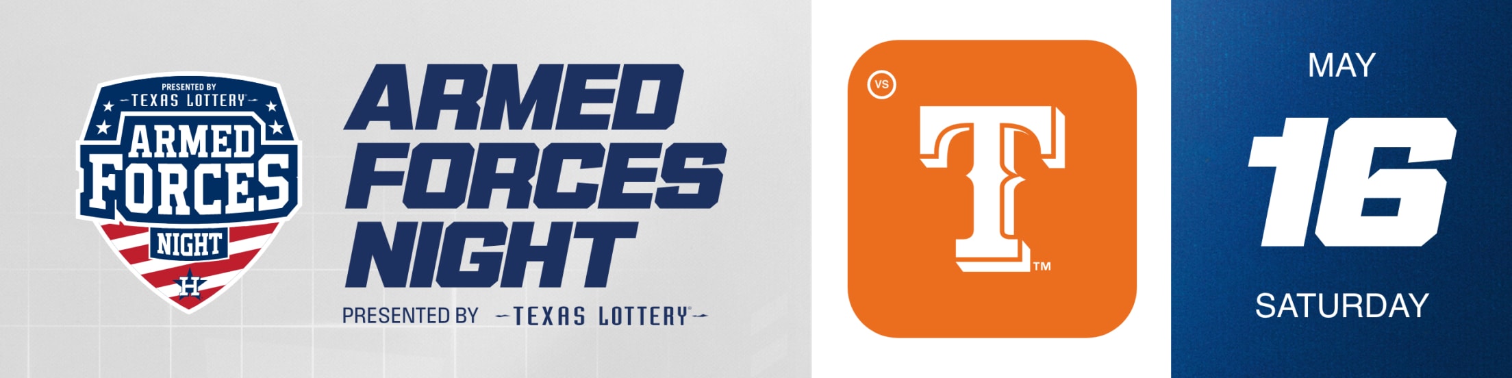 The Houston Astros look forward to proudly honor those who protect and serve our country during our game on May 16th when the Texas Rangers come to town. Please join us early for a special pregame ceremony in honor of Armed Forces Night presented by the Texas Lottery.