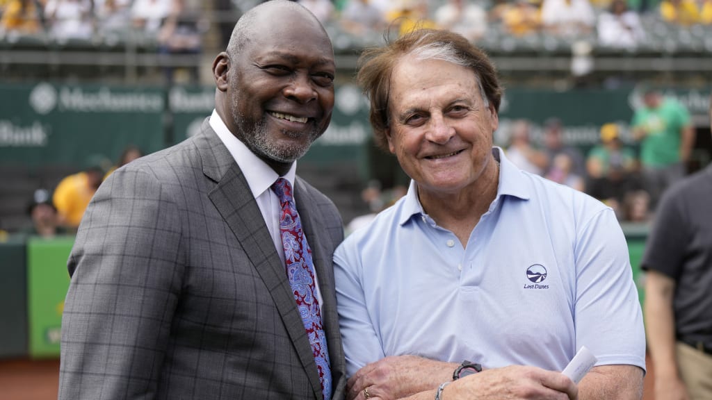 On hand for the pregame ceremony was a star-studded cast of A’s royalty that included Jackson, Henderson, Dennis Eckersley, Terry Steinbach, Mark McGwire and Tony La Russa, who returned to the White Sox on Sunday after being away since Aug. 30 with an ongoing health matter (though he's uncertain whether he will resume managing the club this season). Video messages from those unable to attend included current Astros manager Dusty Baker, a longtime friend of Stewart’s and former teammate with the Dodgers, and Fingers, who gave Stewart his blessing to continue donning the No. 34 jersey when the A’s originally retired the number for him in 1993.