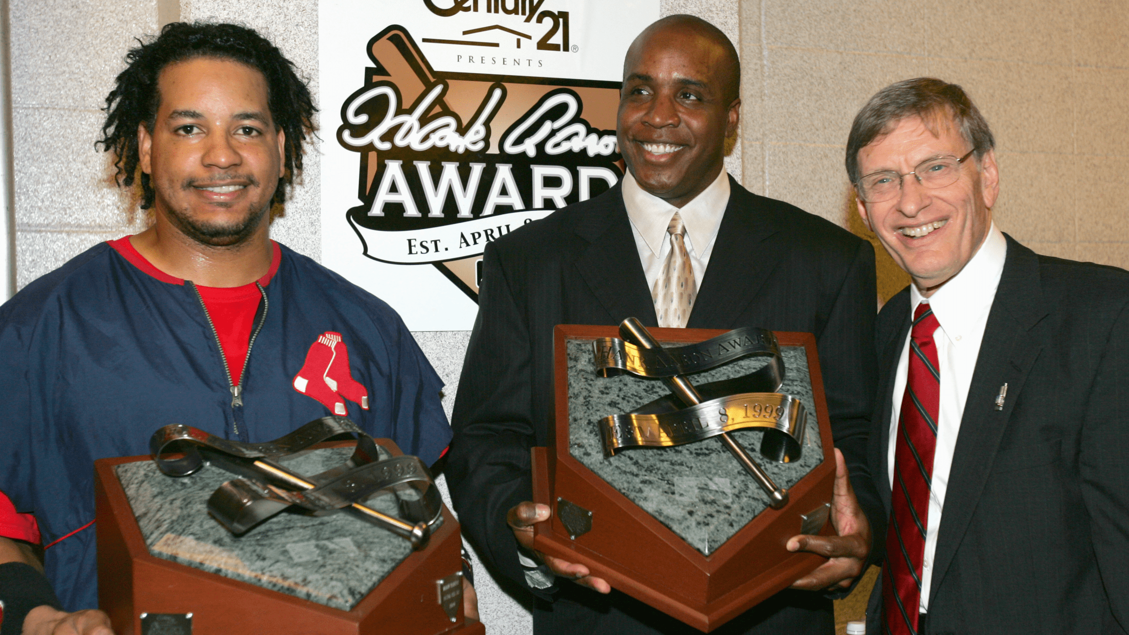 Red Sox outfielder Manny Ramirez and Giants outfielder Barry Bonds were the recipients of the 2004 NL Hank Aaron Award.