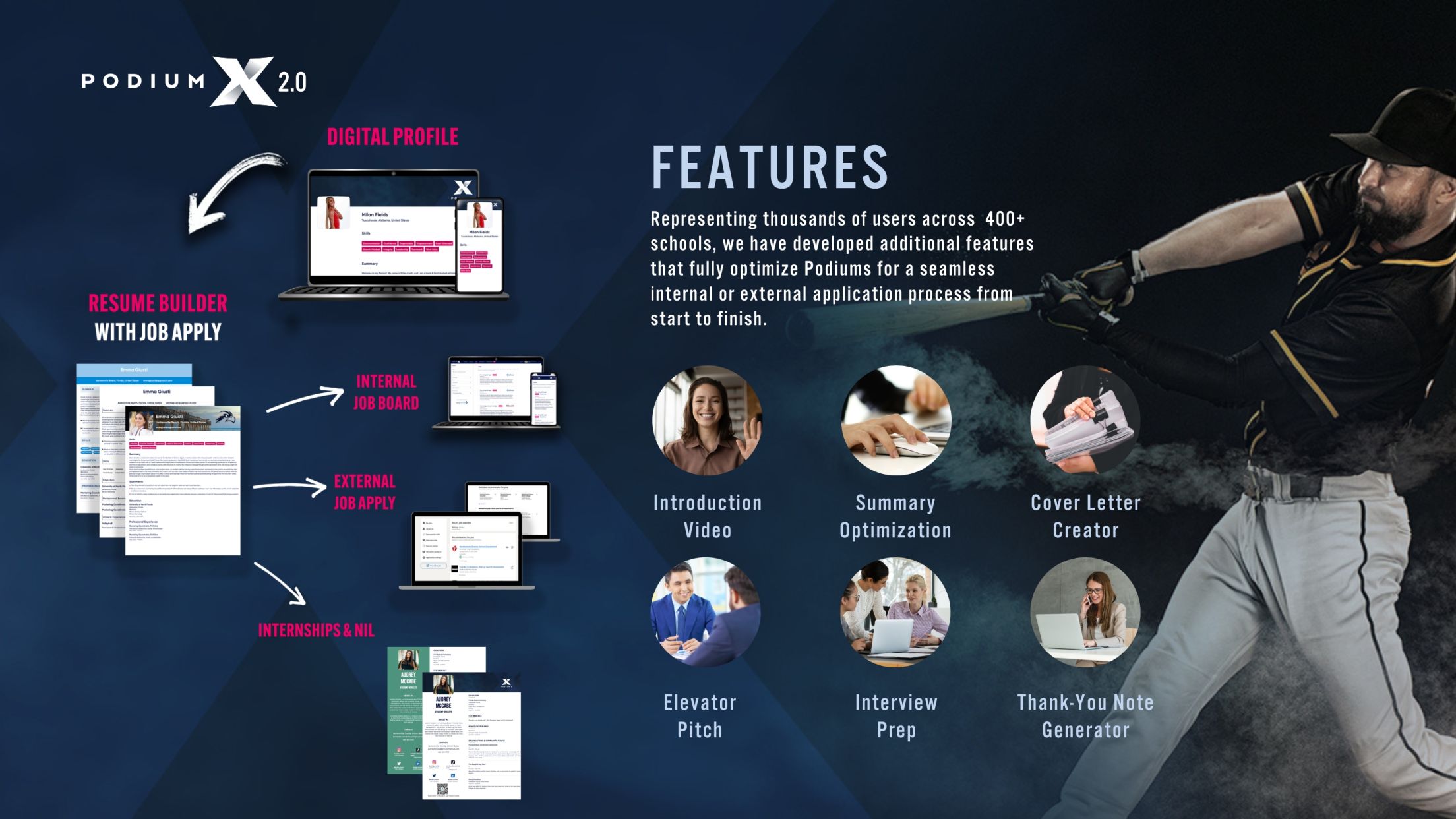 Podium X is a career development partner built for athletes to highlight the unique qualities that make them winners. Podium X has the following tools: