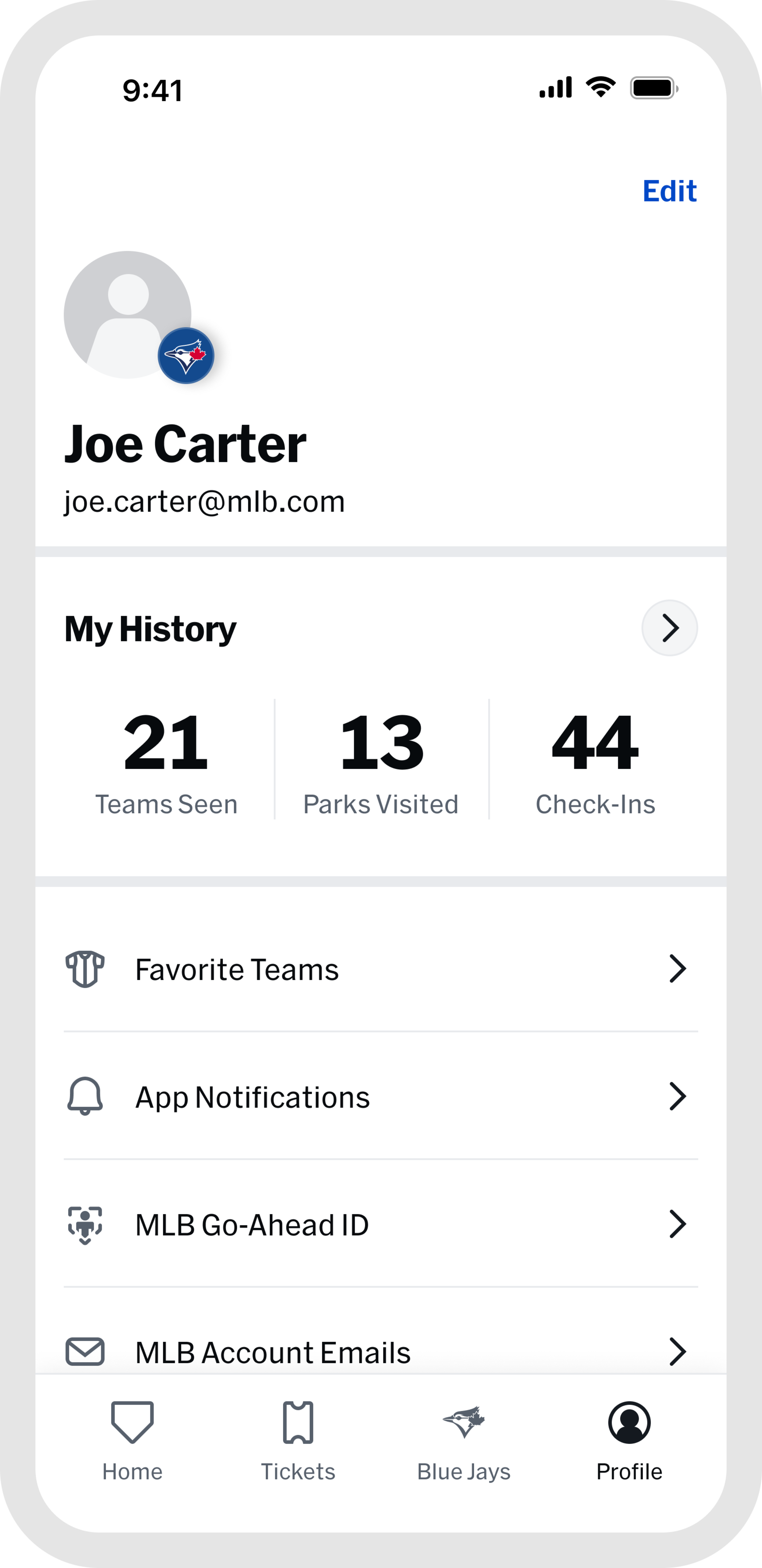 When you arrive at the ballpark, the Home and Blue Jays tabs will be your central source for venue information and features to enhance your stadium visit. To document your visit at Rogers Centre, upload photos of your memories to My History. Simply tap on the Profile link in the top corner to check out the details of your ballpark check-ins.