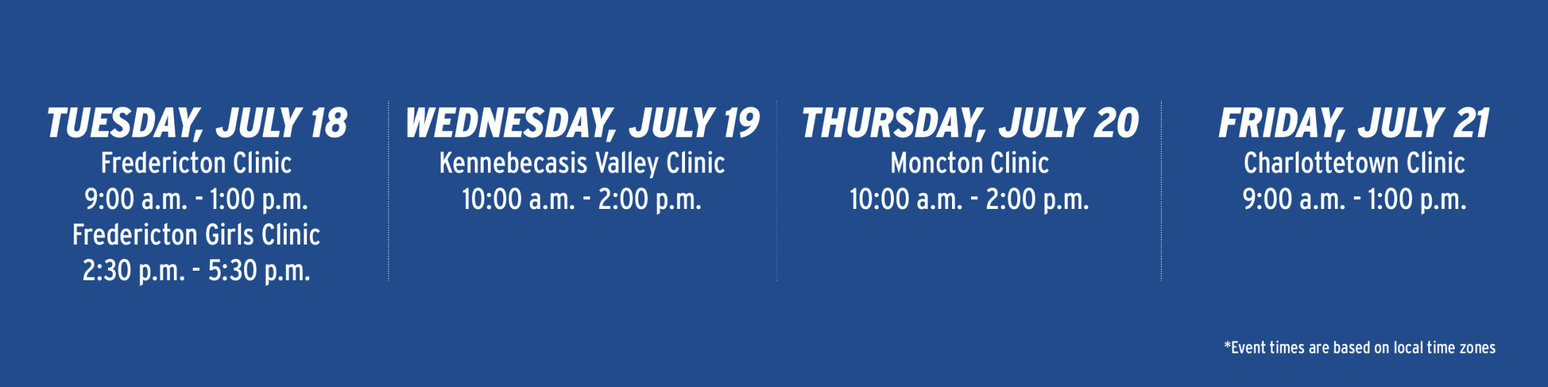 | Girls Clinic | Tues, July 18 | 2:30pm – 5:30pm | Fredericton | Royals Field Complex |