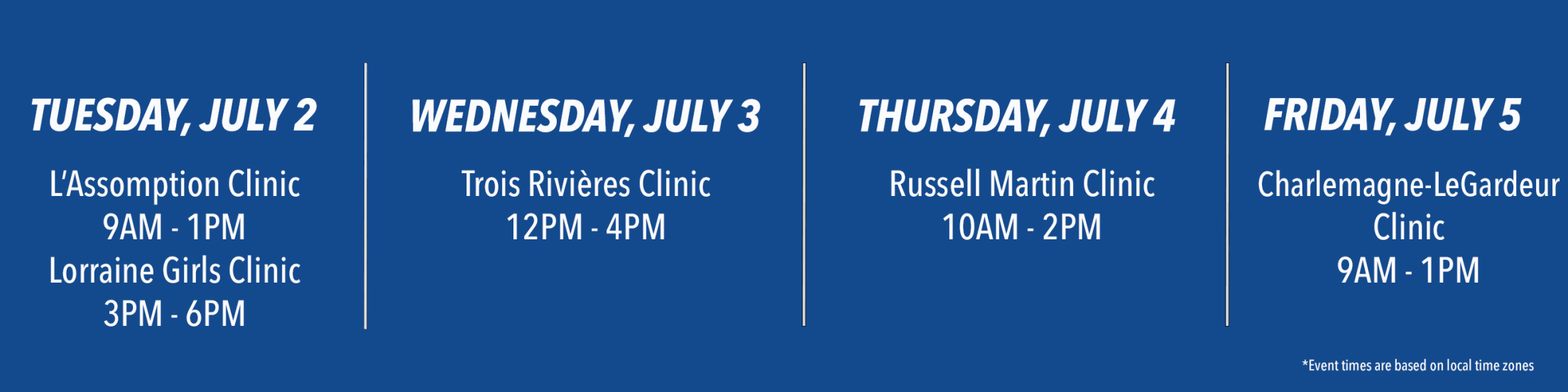 | Clinic | Wednesday July 3, 2024 | 12:00 PM – 4:00 PM | Trois Rivières, QC - SOLD OUT | Leo Carbonneau Stadium |