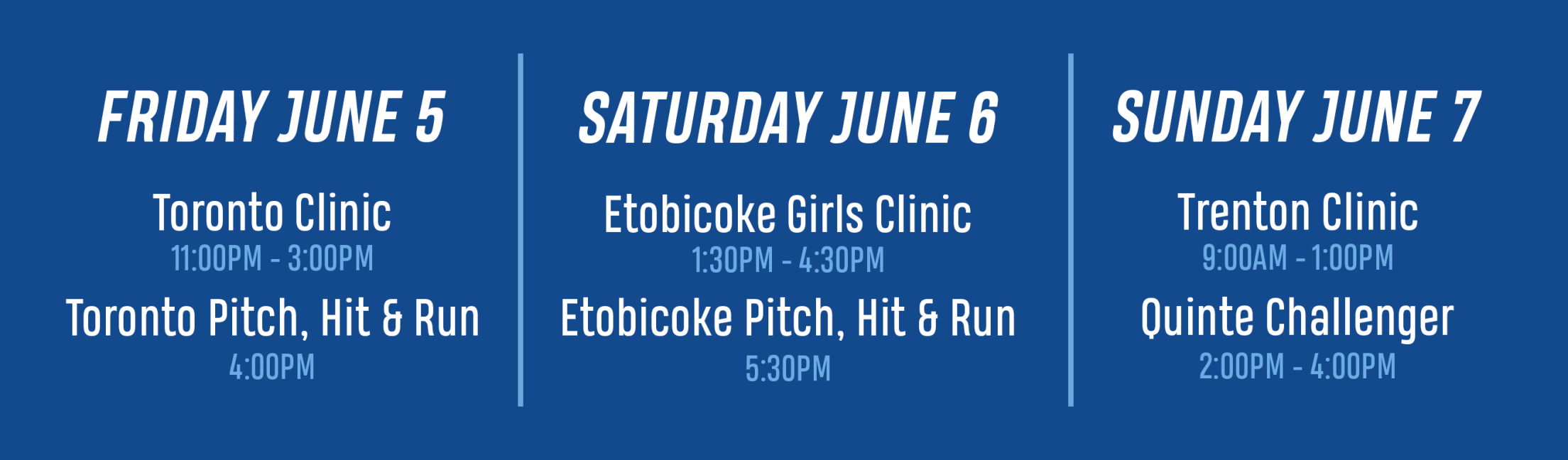 | Saturday June 6, 2026 (*Girls Clinic) | 1:30 PM – 4:30 PM | Etobicoke, ON | Connorvale Park |