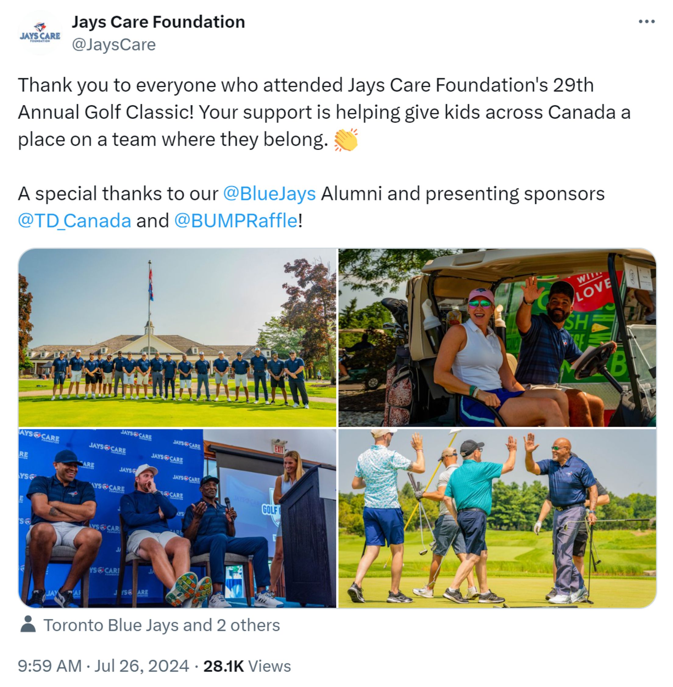To learn more about Jays Care Foundation’s Annual Golf Classic or unique opportunities to engage your clients and employees, please contact: JaysCareEvents@Bluejays.com.