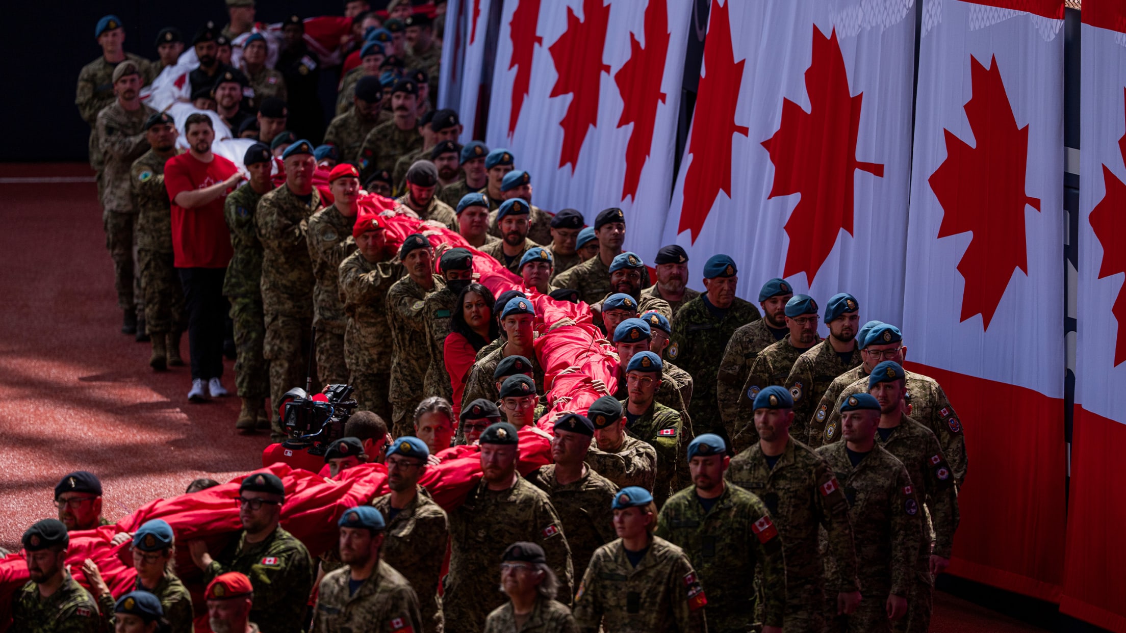 Celebrating the 60th anniversary of the Canadian Flag, Blue Jays players, coaches, and support staff joined the 200 military members during the Canadian National Anthem holding the flag that spans across the entire outfield.