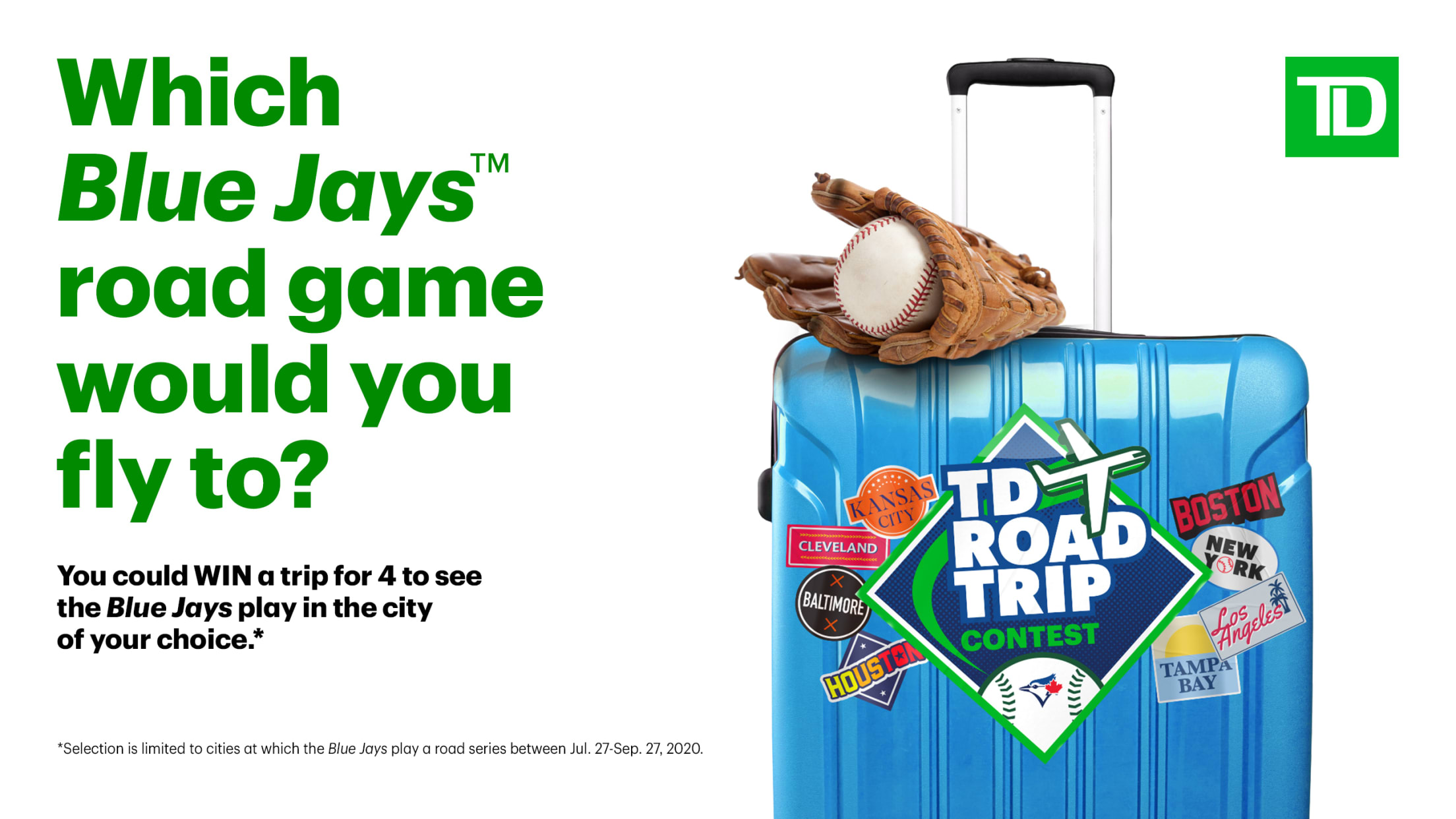 * Prize will include 4 tickets to 4 Toronto Blue Jays road games (16 tickets total) in the preferred destination if Houston (August 6-9, 2020), Tampa Bay (August 10-13, 2020), or New York (August 20-23, 2020) are selected as the preferred destination OR 4 tickets to 3 Toronto Blue Jays road games (12 tickets total) in the preferred destination if Los Angeles (July 27-29, 2020), Kansas City (August 24-26, 2020), Baltimore (September 8-10, 2020), New York (September 11-13, 2020), Boston (September 22-24, 2020), or Cleveland (September 25-27, 2020) are selected as the preferred destination. The dates referenced are the dates of the Blue Jays games taking place in each destination.