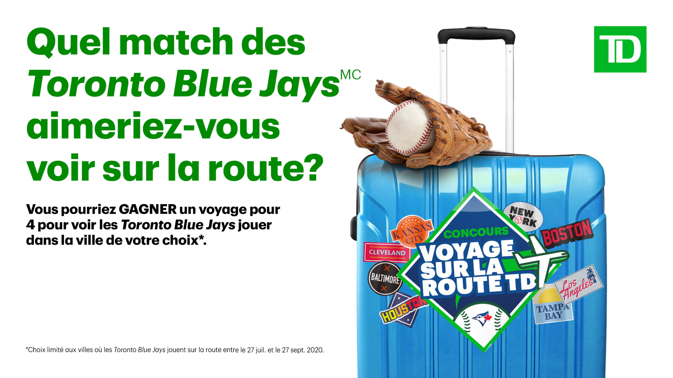 Le prix comprend 4 billets pour 4 matchs sur la route des Toronto Blue Jays (16 billets au total) dans la destination privilégiée si Houston (du 6 au 9 août 2020), Tampa Bay (du 10 au 13 août 2020) ou New York (du 20 au 23 août 2020) est choisie comme destination privilégiée OU 4 billets pour 3 matchs sur la route des Toronto Blue Jays (12 billets au total) dans la destination privilégiée si Los Angeles (du 27 au 29 juillet 2020), Kansas City (du 24 au 26 août 2020), Baltimore (du 8 au 10 septembre 2020), New York (du 11 au 13 septembre 2020), Boston (du 22 au 24 septembre 2020) ou Cleveland (du 25 au 27 septembre 2020) est choisie comme destination privilégiée. Les dates indiquées correspondent aux dates des matchs des Toronto Blue Jays qui auront lieu dans chaque destination.