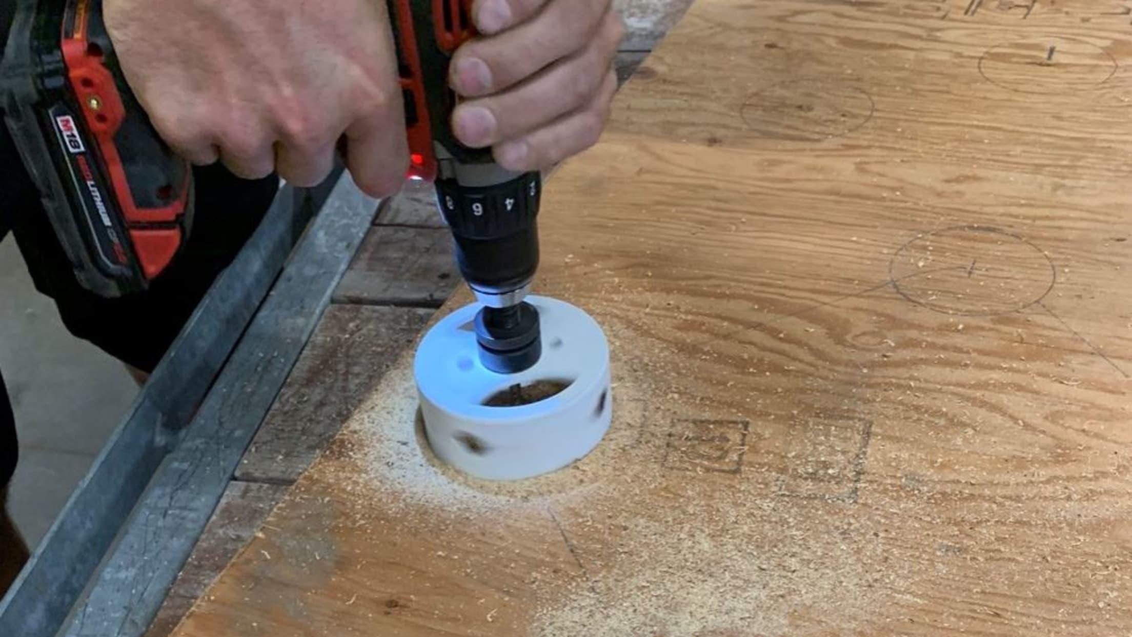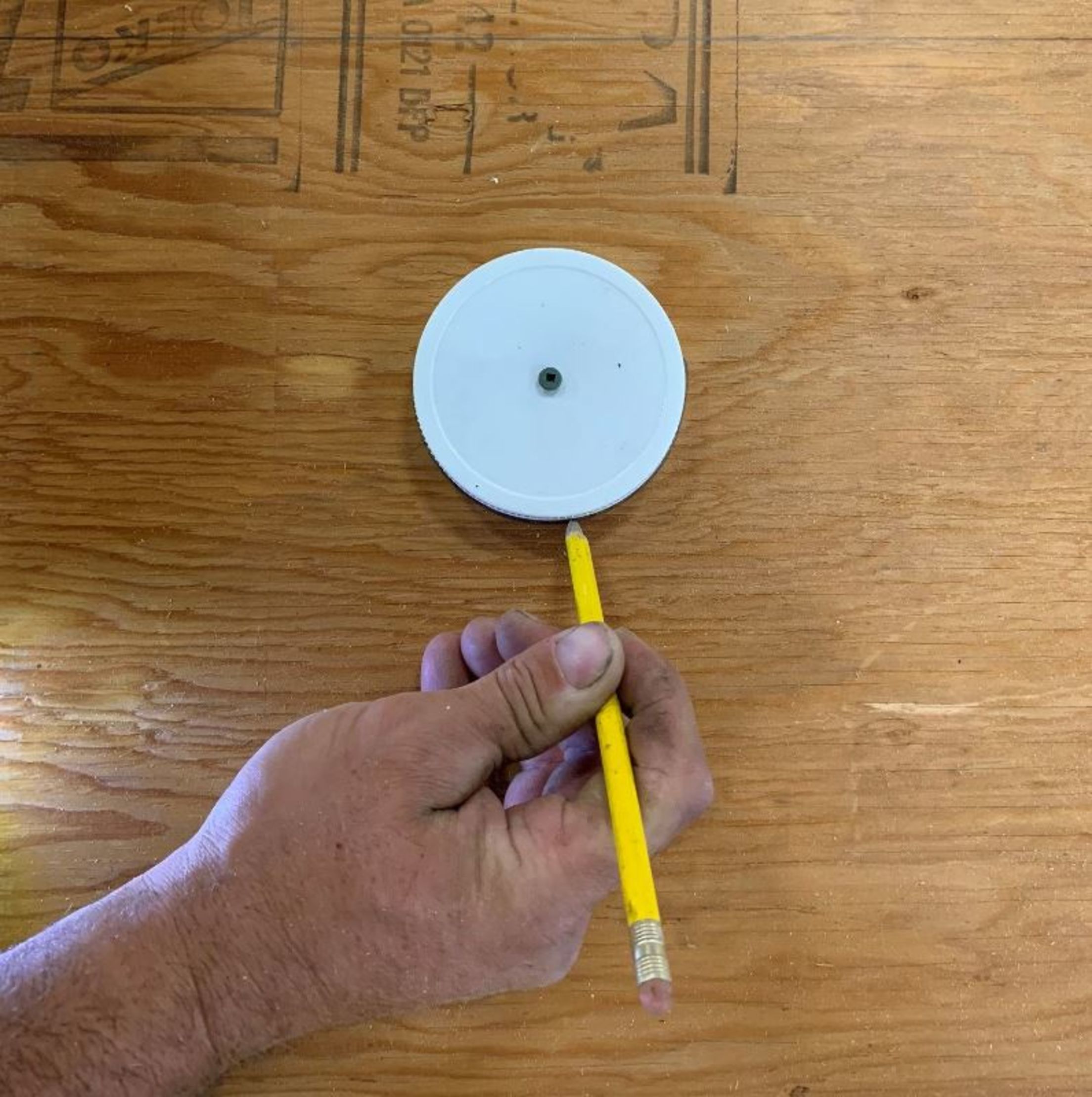 Tip: Use a circular object approximately the same size as the hole saw to mark the holes. This makes visualizing the finished board so much easier. We found the lid for the deck screws to be a pretty great match.