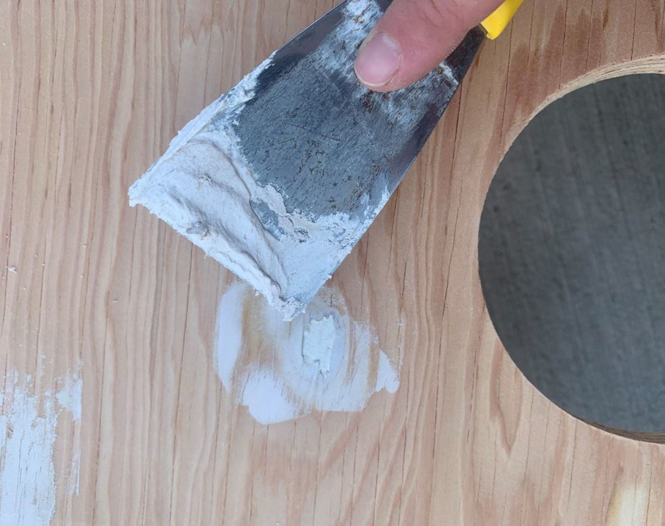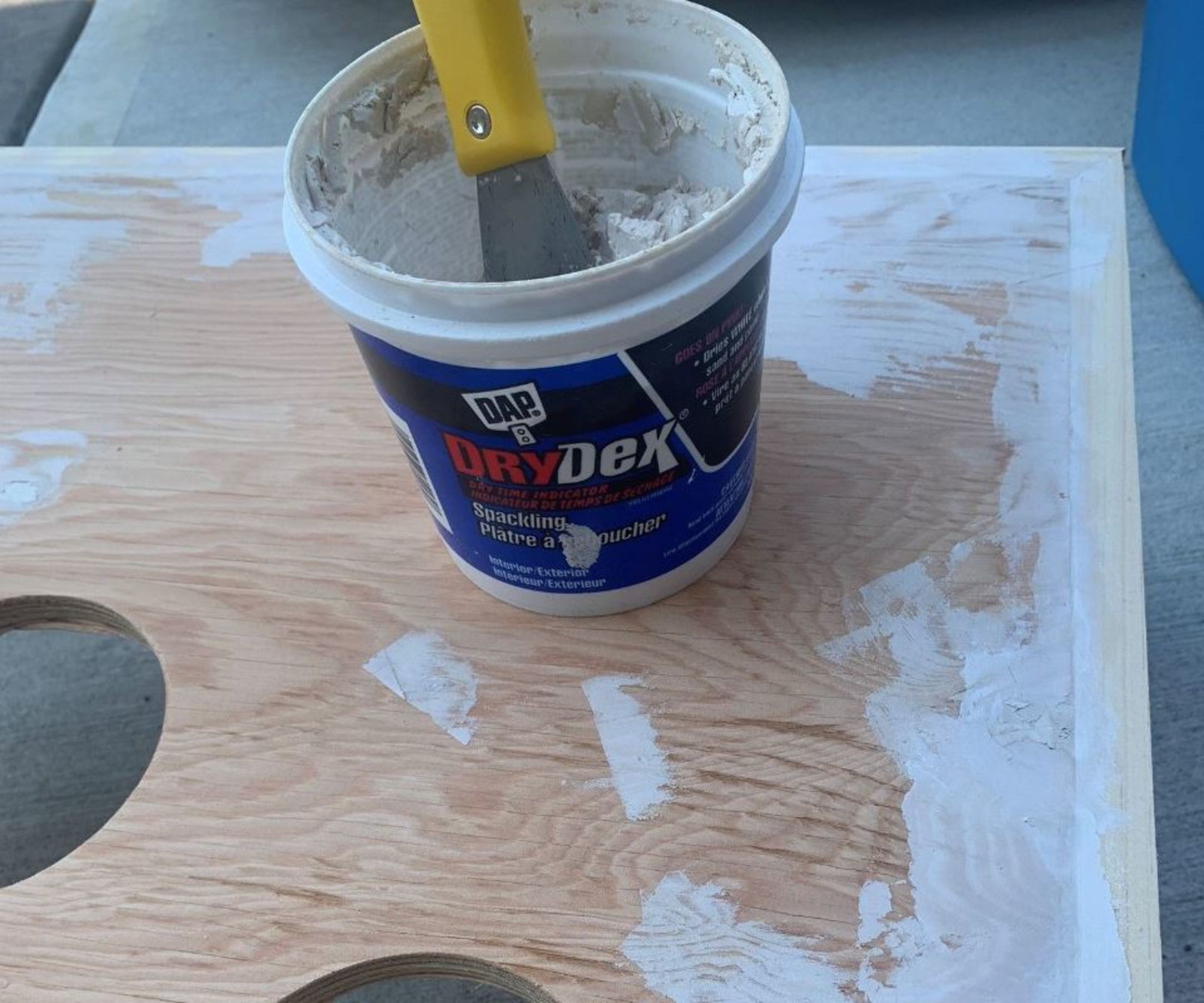 8. Using either wood filler or DryDex and a putty knife fill in any knots, gaps, or cracks in the wood (trust us -this step is important if you are painting).