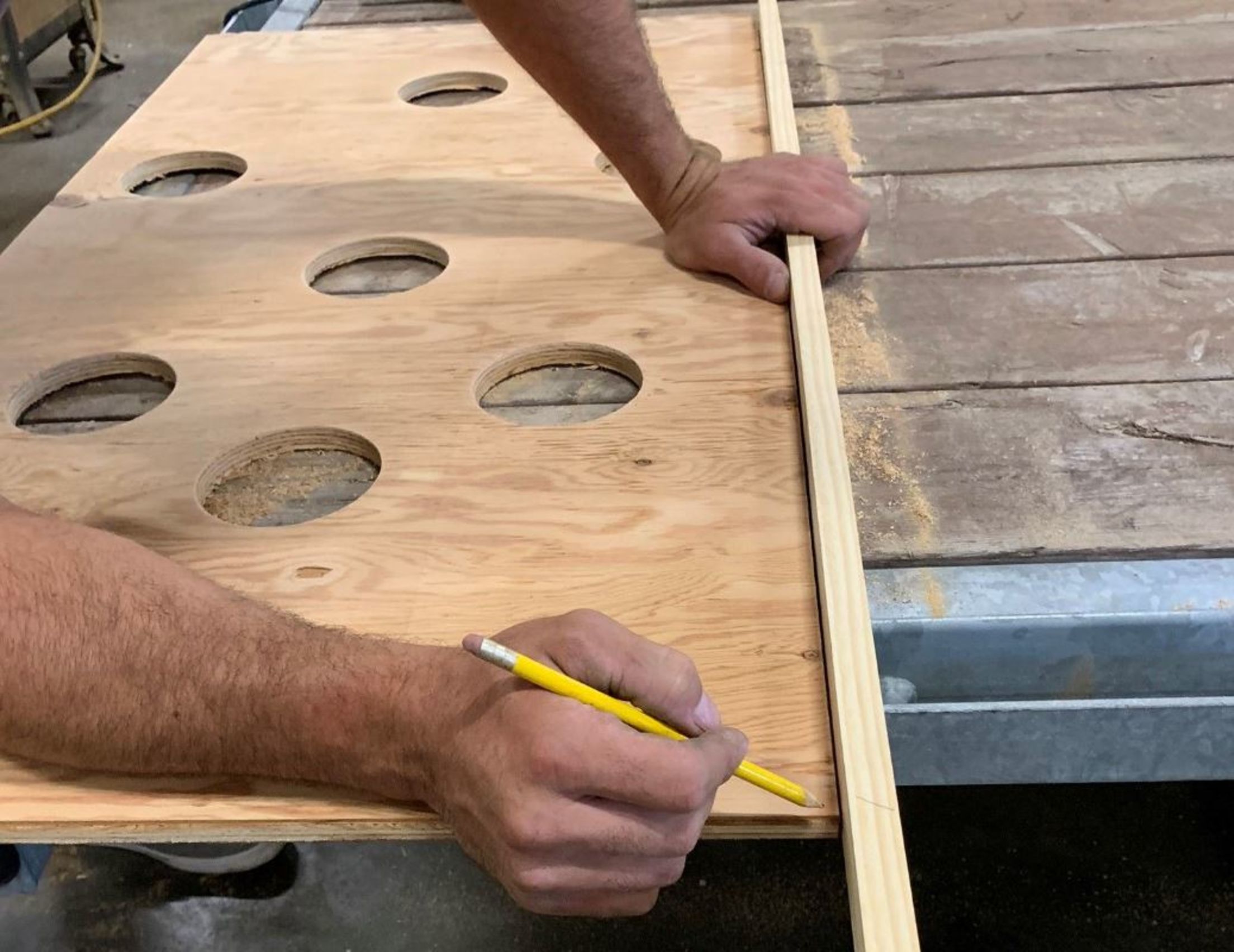 2. Using a pencil, roughly sketch on the board where you’d like the holes to go. We made sure to leave 6” of free space at the top of the board to allow room for a score board.