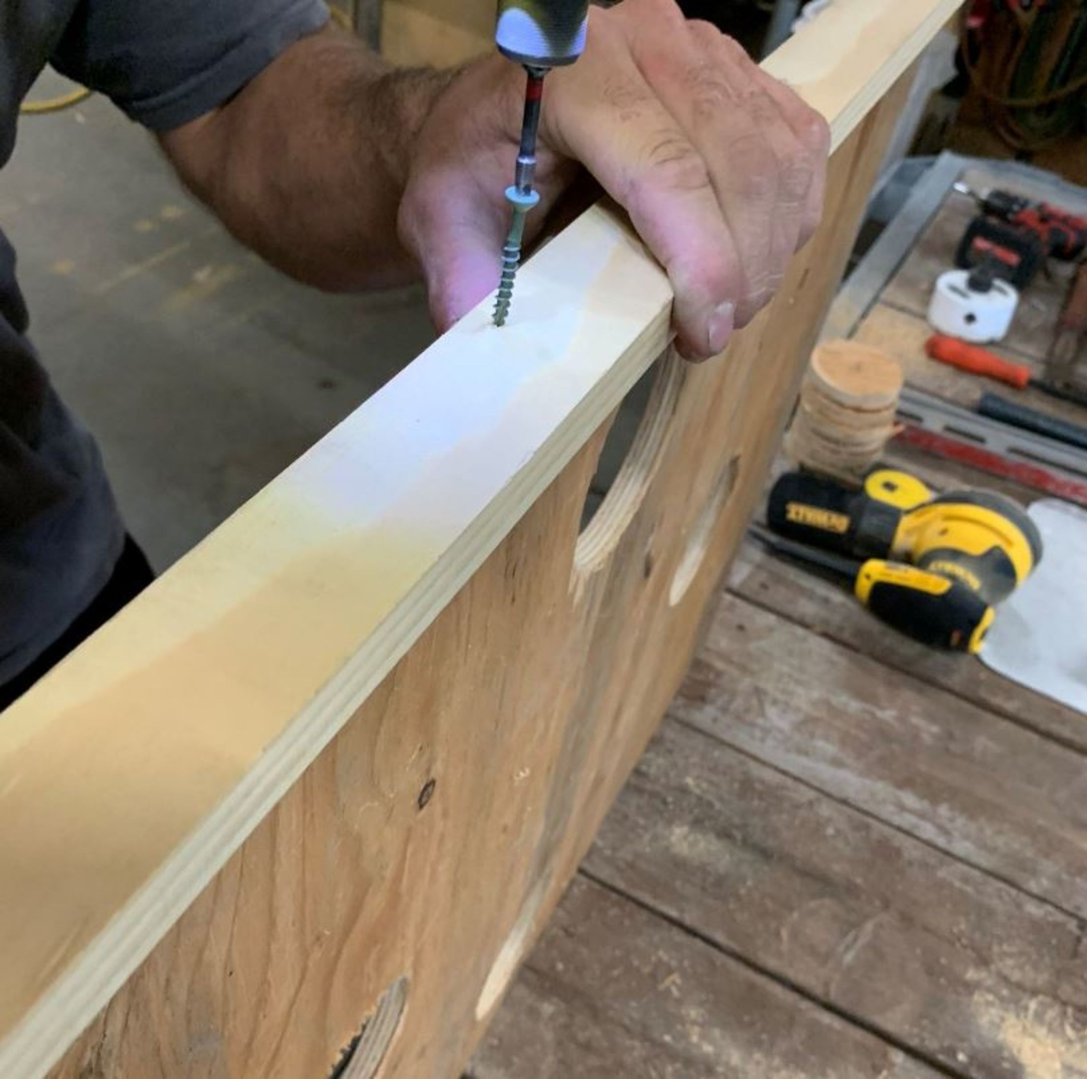 5. Next, cut the 1”x2” pine to create a frame around the board. We cut the corners on a 45 to create a clean look. The frame was then attached with deck screws to the sides of the plywood.