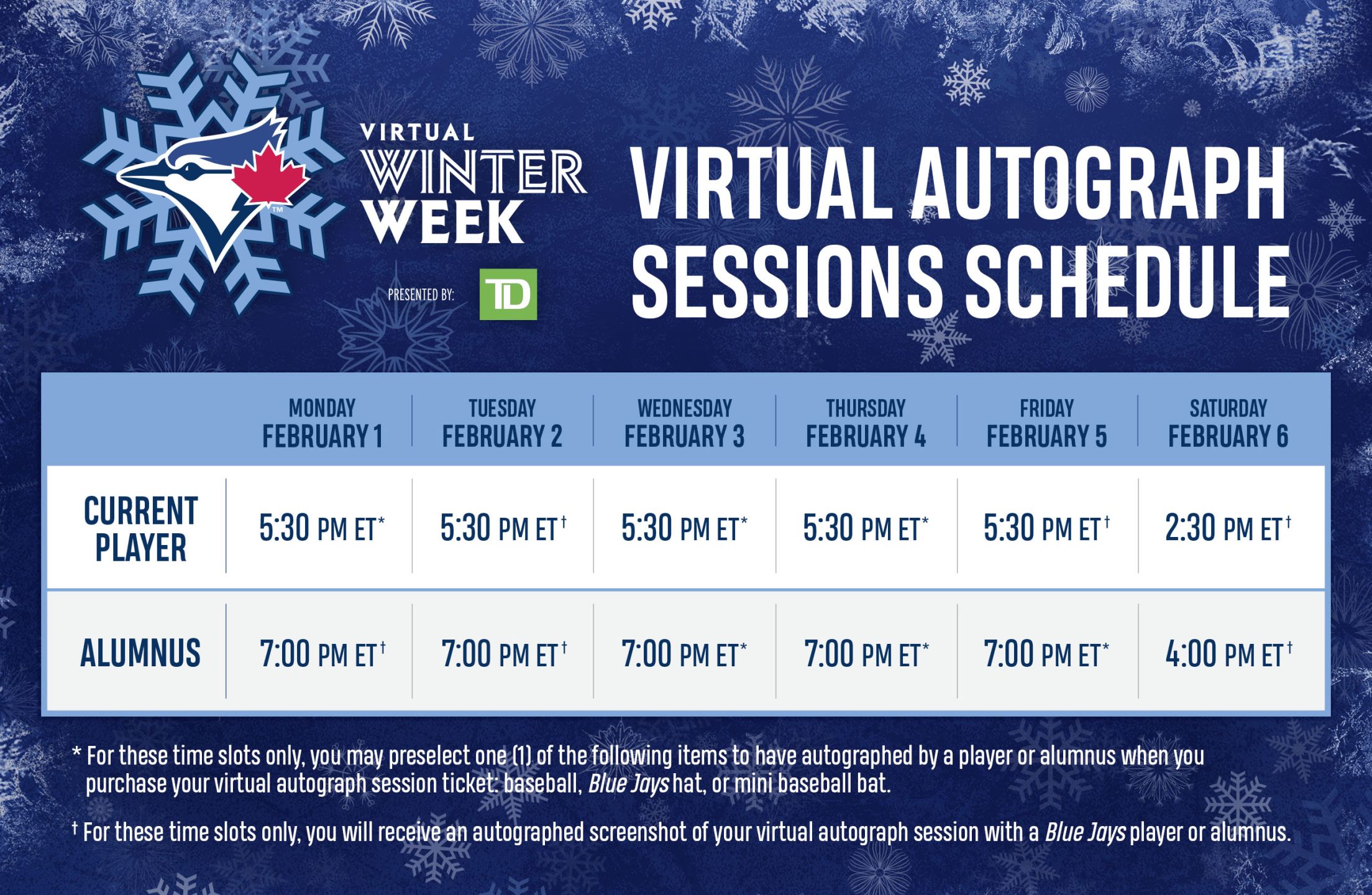 2. For select timeslots only, one (1) pre-selected item (choice of baseball, Blue Jays hat or mini baseball bat) to be autographed by a Blue Jays player or alumnus. Specific item must be selected at the time of purchase and will be shipped to the purchaser’s mailing address indicated at the time of purchase, once the session is complete.