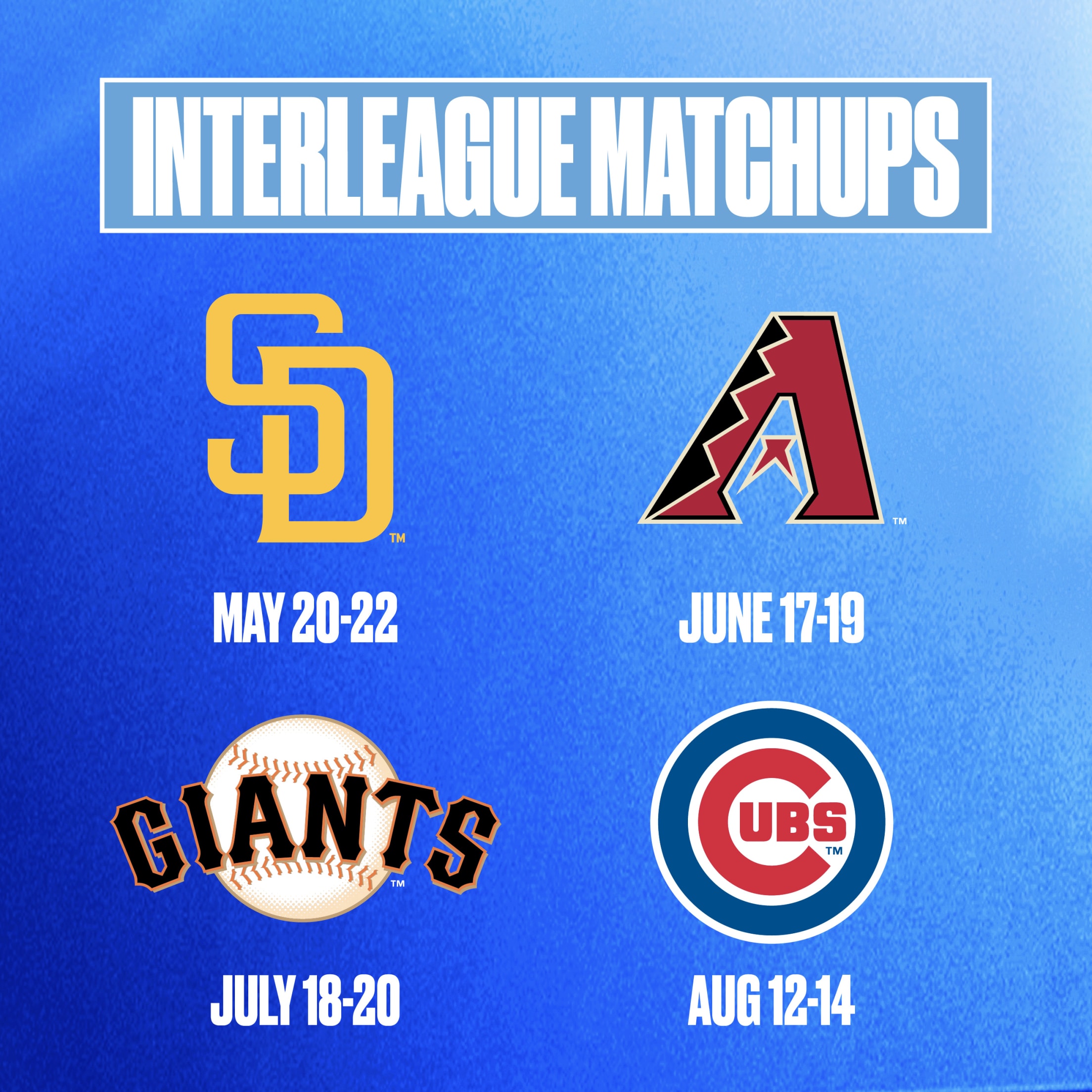 48 interleague matchups, with home series against the Washington Nationals (March 31 to April 2), Atlanta Braves (April 14 to 16), San Diego Padres (May 20 to 22), Philadelphia Phillies (June 3 to 5), Arizona Diamondbacks (June 17 to 19), San Francisco Giants (July 18 to 20), Chicago Cubs (August 12 to 14), and Milwaukee Brewers (August 29 to 31).