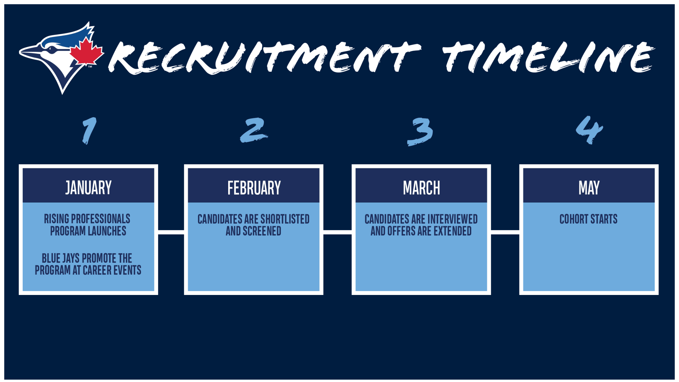 This is an exclusive opportunity tailored for both recent graduates and early-career professionals. Selected individuals will become part of a diverse cohort with access to department-specific training, social activities and learning opportunities. Each participant will also be assigned a cross departmental mentor from within the organization to guide them throughout the program and the unique chance to present to the Toronto Blue Jays Leadership Team.