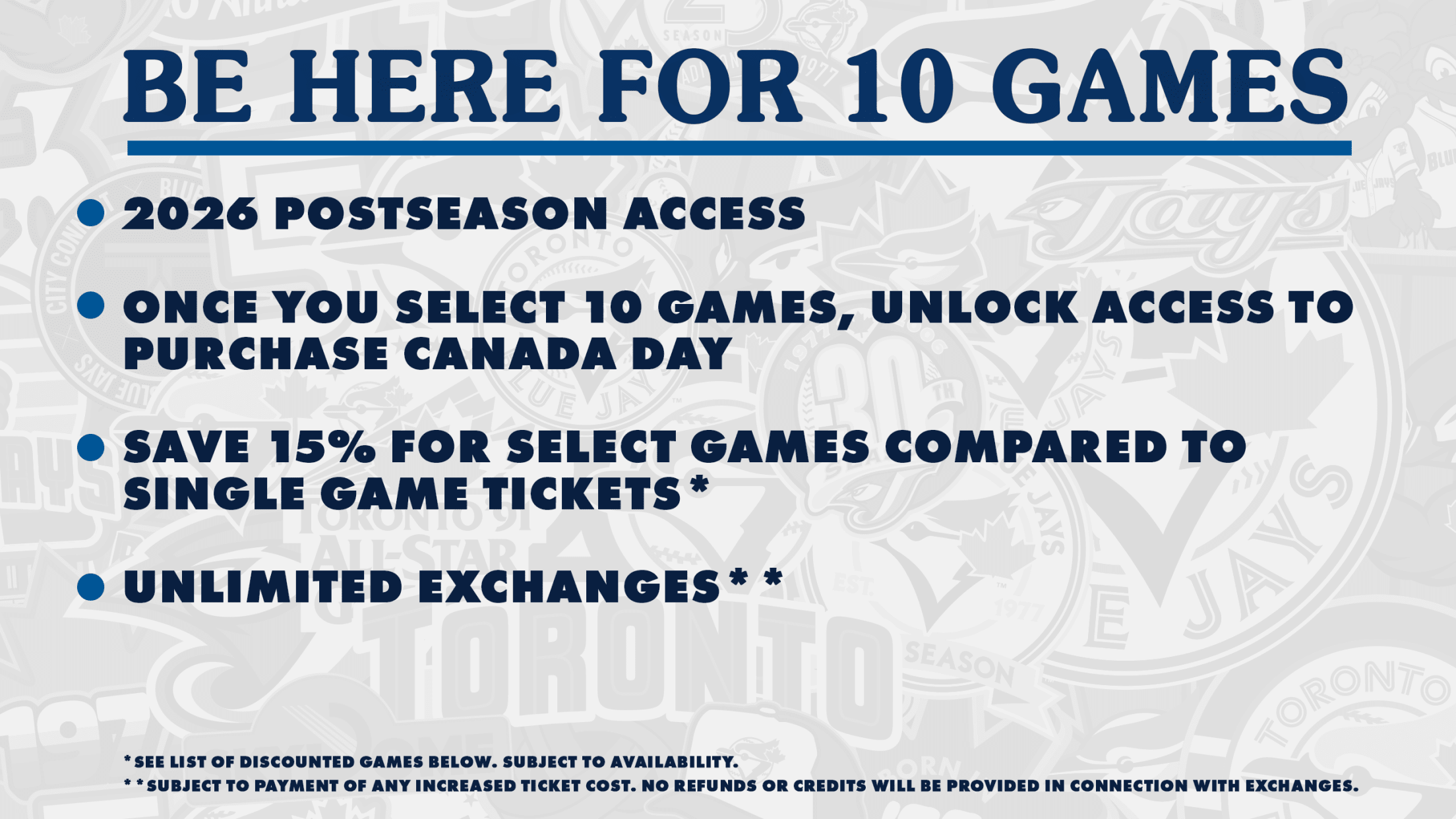 After purchasing your Flex Pack, enjoy the flexibility of unlimited ticket exchanges up to 48 hours before game time on Blue Jays Account Manager. Game dates and seating locations are valued at different tiers but you can exchange your tickets for the same or lower priced ticket at no additional cost. If there is an increase in cost between your current tickets and new tickets, you are responsible for payment of the increased ticket cost. No refunds or credits will be provided in connection with exchanges. You may exchange up to eight (8) tickets from your Flex Packs to any one game. Your Flex Pack tickets will be available to be managed on your Toronto Blue Jays Account Manager on or before March 2, 2026.