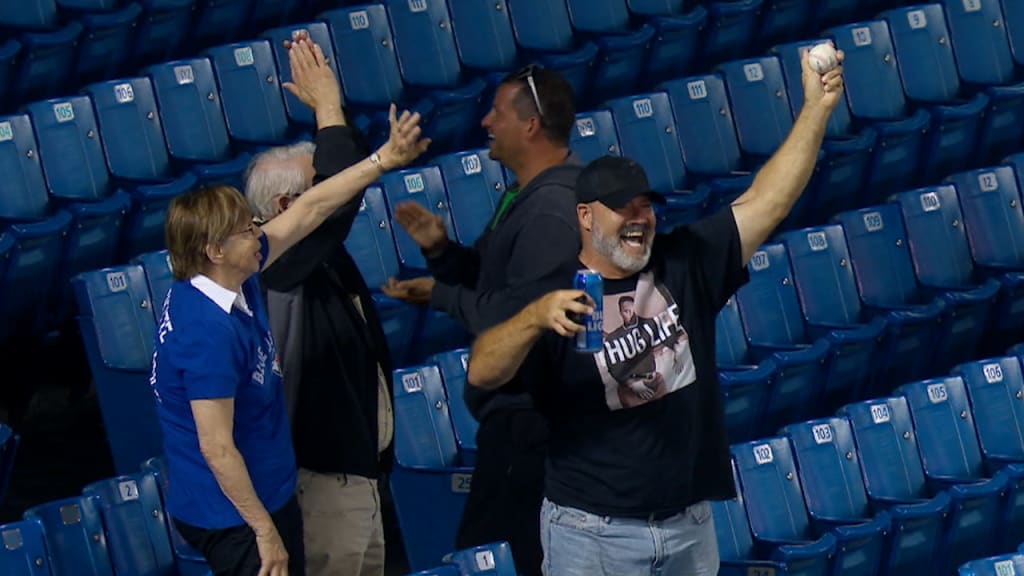 A fan receives applause as he catches Yordan Alvarez's foul ball with his bare hand in the stands