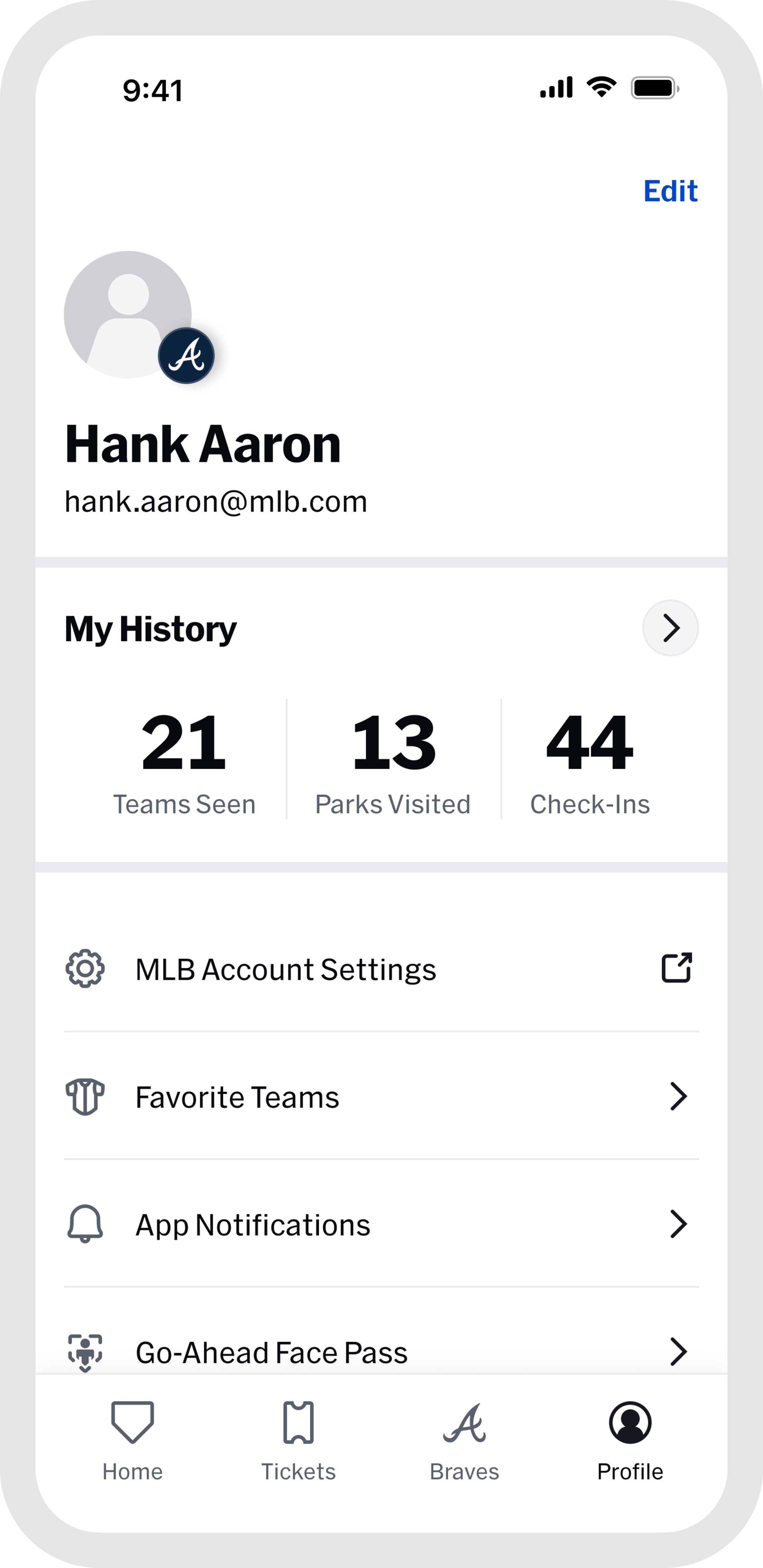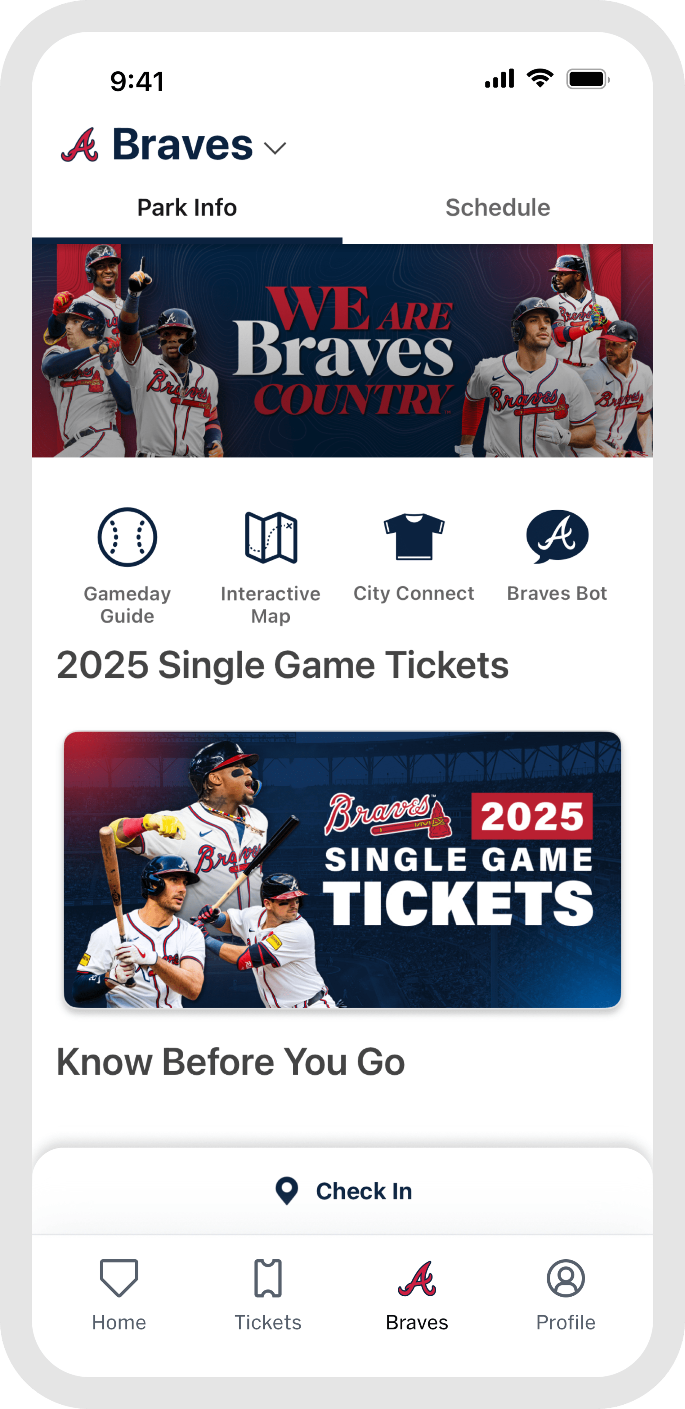 Once you arrive, the "Home" and "Braves" tabs become your go-to resource for venue details and features that enhance your gameday experience. Capture and preserve your ballpark memories by tapping "My History" within the "Profile" tab.