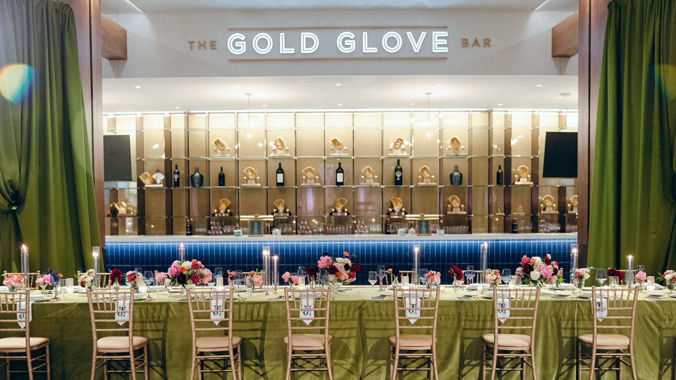 The Delta SKY360° Club is located on the Field Level with direct access to the Stadium’s seating bowl. With over 17,000 square feet, this premium event space offers 15 foot ceilings and unobstructed views for up to 400 at a seated dinner. The space has two separate bars, The Gold Glove Bar and The Chairman’s Lounge, which is perfect for pre-dinner cocktails.