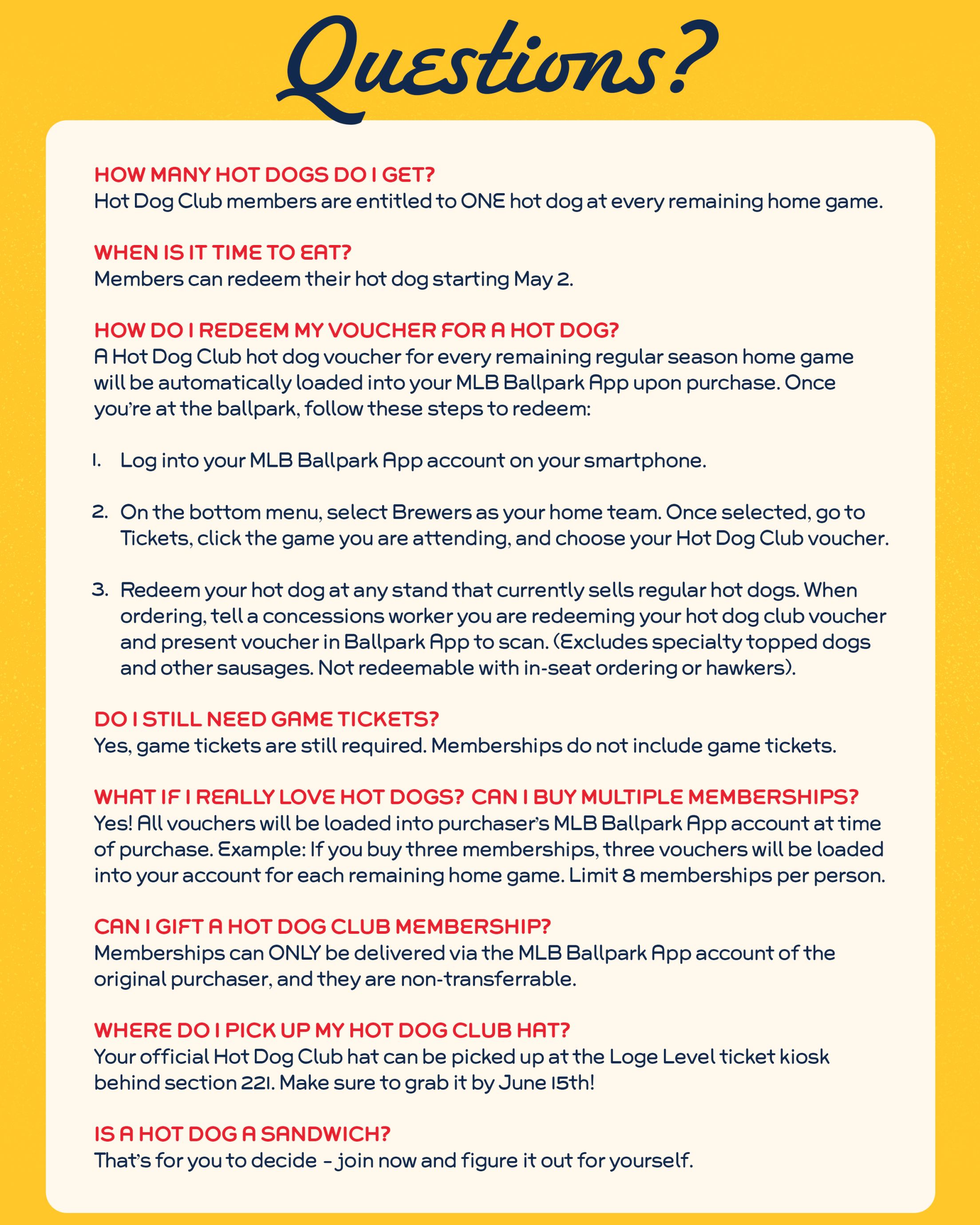 Members must purchase a Hot Dog Club membership to participate. Limit eight (8) Hot Dog Club memberships per person. Members will receive one (1) free hot dog voucher per membership purchased in the MLB Ballpark App for every Milwaukee Brewers 2025 regular season home game starting with the game on May 2, 2025. Vouchers are redeemed by scanning the voucher at American Family Field concessions stands throughout the ballpark. All terms and conditions for use of the MLB Ballpark mobile app apply. Hot Dog Club vouchers are non-transferable and may not be redeemed by anyone other than the Hot Dog Club member in possession of the voucher. Membership may be revoked at any time at the sole discretion of the Milwaukee Brewers. Members agree to release, discharge, and hold harmless the Milwaukee Brewers Baseball Club, L.P., the Wisconsin Professional Baseball Park District, Delaware North Sportservice, Major League Baseball, and their respective parent corporations, subsidiaries, and affiliates, together with their owners, partners, employees, officers, directors, and agents, from and against any and all claims, demands, injuries, losses, and liabilities arising out of Hot Dog Club membership. By purchasing a membership, members grant the Milwaukee Brewers and its designees the right to use and/or publicize such member’s name, address (city and state of residence), photograph, voice, and/or other likeness, biographical and/or prize information in any media now known or hereafter devised, throughout the world, in perpetuity without additional compensation or consideration, notification, or permission, except to the extent prohibited by law. In case of violation of applicable laws, regulations, or these terms and conditions, or fraud or abuse involving the Hot Dog Club, (a) the Club will have the right to take appropriate administrative and/or legal action, including but not limited to revocation/cancellation of membership; and (b) violators will be liable for payment of all fines, penalties, costs, fees, and any other monies owed pursuant to any applicable law. If any term of these terms and conditions is held to be unlawful or unenforceable, then the Milwaukee Brewers and/or the Member, as applicable, shall be relieved of such unlawful or unenforceable obligation under that term and the remaining provisions will be enforced to the fullest extent permitted by law. The Program is governed by Wisconsin law. All decisions made by the Milwaukee Brewers are final. The Milwaukee Brewers reserve the right to change, limit, or otherwise modify these terms and conditions or discontinue the Hot Dog Club at any time in its sole discretion. Memberships are not refundable, exchangeable, replaceable or transferable