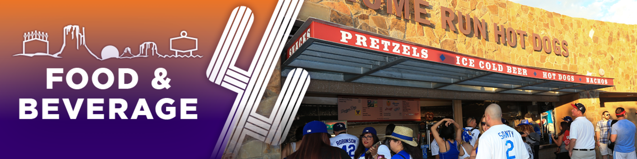 Grand Slam Helmet Nachos, Dodger Dogs,Vienna Beef all-beef dogs, pretzels, nachos, potato chips, Cracker Jack, Pepsi products, Aquafina water, Gatorade, draft beer.