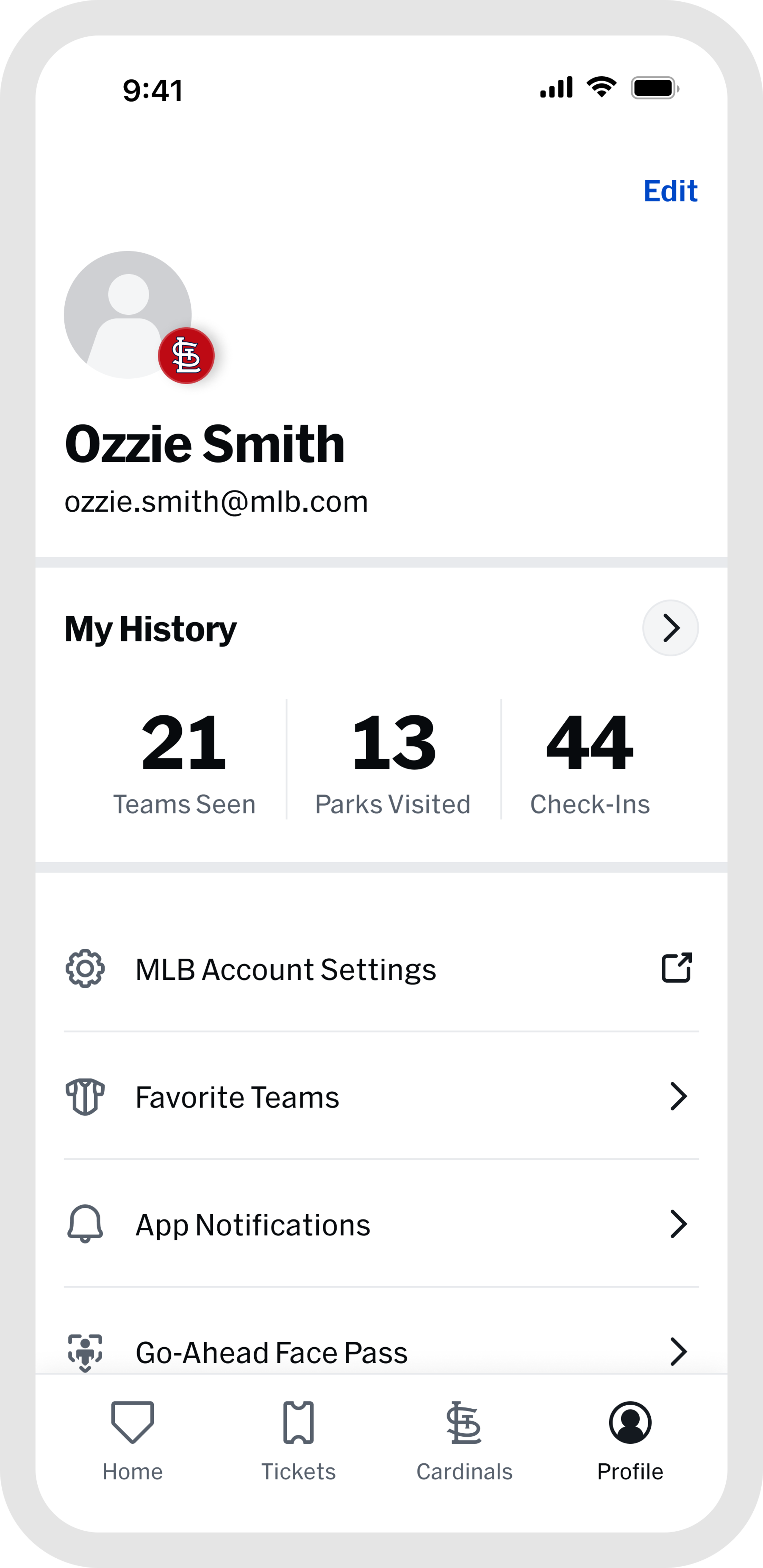 Once you arrive, the "Home" and "Cardinals" tabs become your go-to resource for venue details and features that enhance your gameday experience. Capture and preserve your ballpark memories by tapping "My History" within the "Profile" tab.