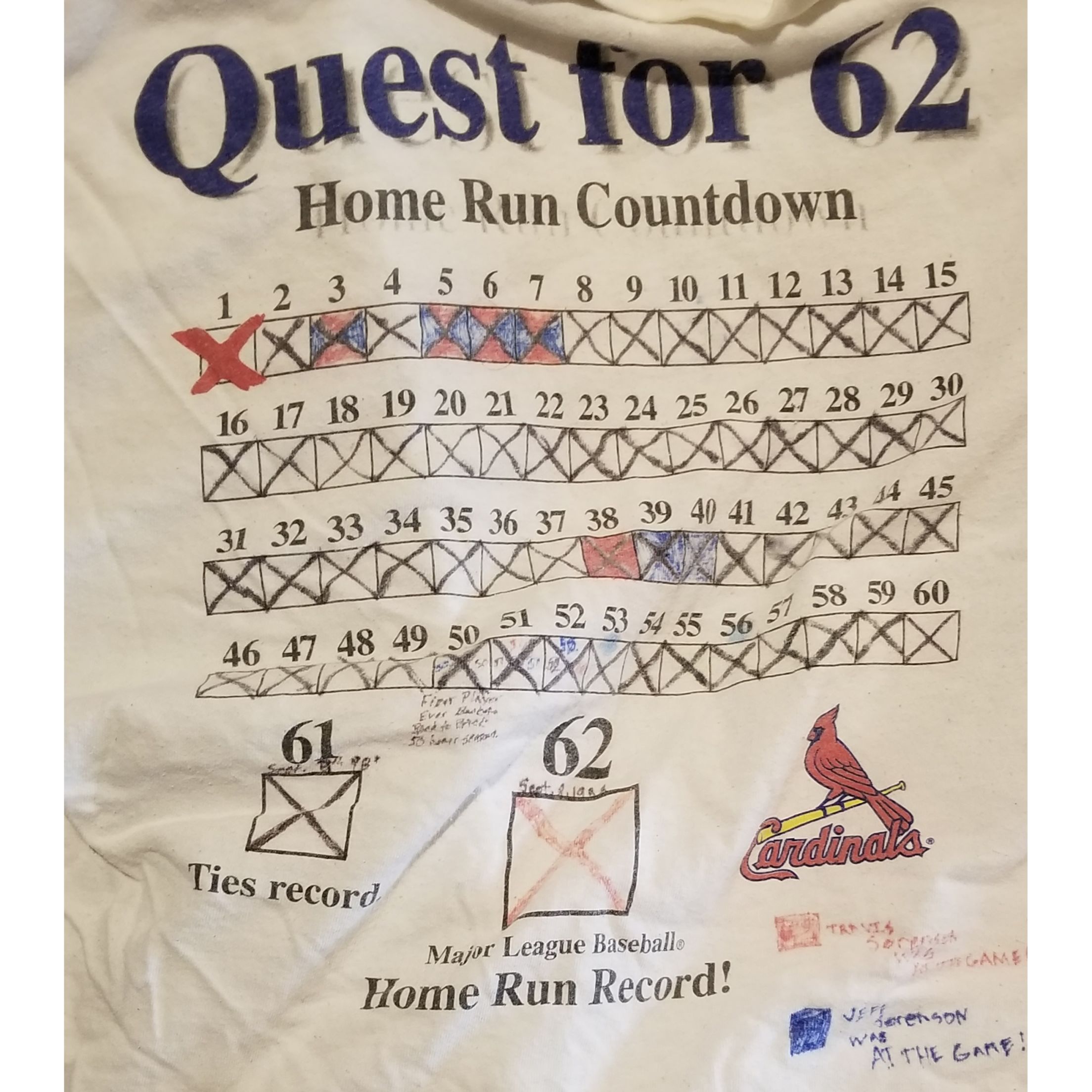 This is a shirt I bought when I lived in Missouri. It allows you to mark off when Big Mac hit his homers up to 62. My brother and I decided to color in the boxes of games we attended. My favorite was probably his 3 Homer game against the Diamondbacks. We sat down and he hit his first about 30 seconds later. Also, I got to be there when he rocked an extra innings blast off of Billy Wagner to win the game. Wagner thought he could get 3 fastballs past a slumping McGwire. He was wrong. It landed about 2 rows above Big Mac Land. One the most exciting summers of my life and I was only 12!